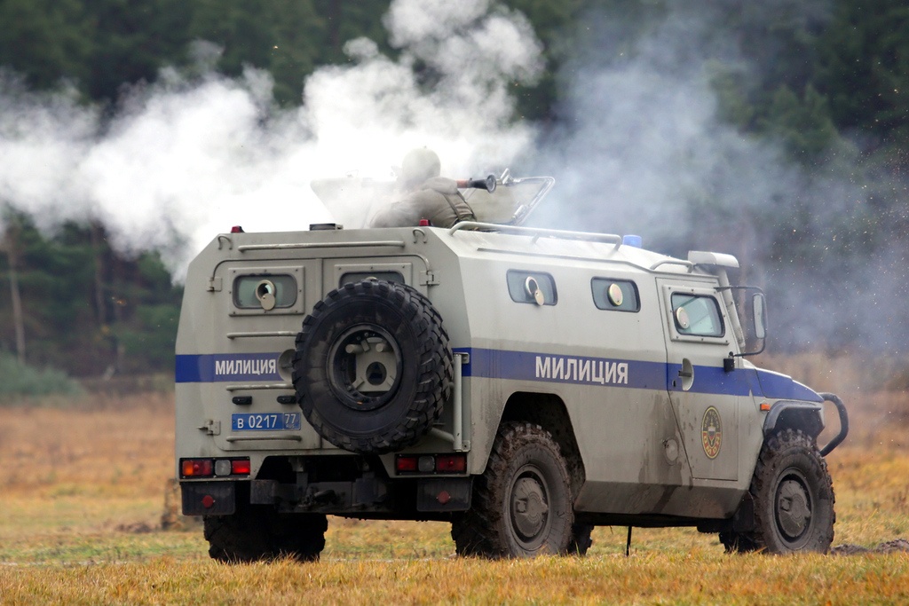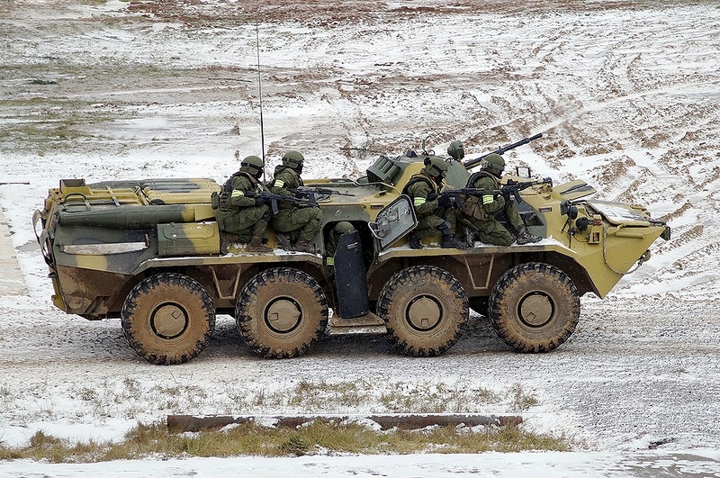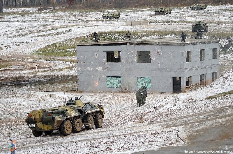 Cảnh sát đặc nhiệm vũ trang di chuyển cùng một chiếc xe bọc thép tại khu huấn luyện gần thủ đô Moscow. |