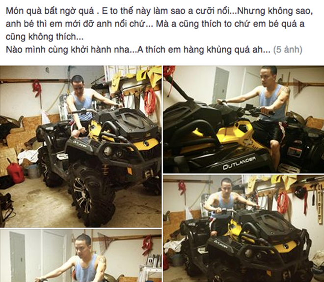 | Mới đây, nam ca sĩ tiếp tục được tặng một chiếc xe mô tô địa hình có giá khoảng 250 triệu từ một người bạn ở Mỹ. |