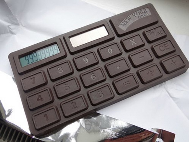 Là chiếc máy tính bỏ túi được ngụy trang dưới hình dạng thanh socola, món quà này đủ sức tạo bất ngờ cho bất cứ ai được tặng. Lớp vỏ được làm theo dạng socola với chất liệu nhựa cứng PVC bắt mắt, trong khi đó, người dùng có thể sử dụng như một chiếc máy tính ở mặt trước.