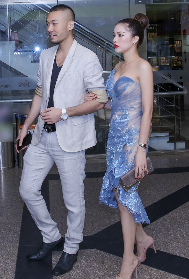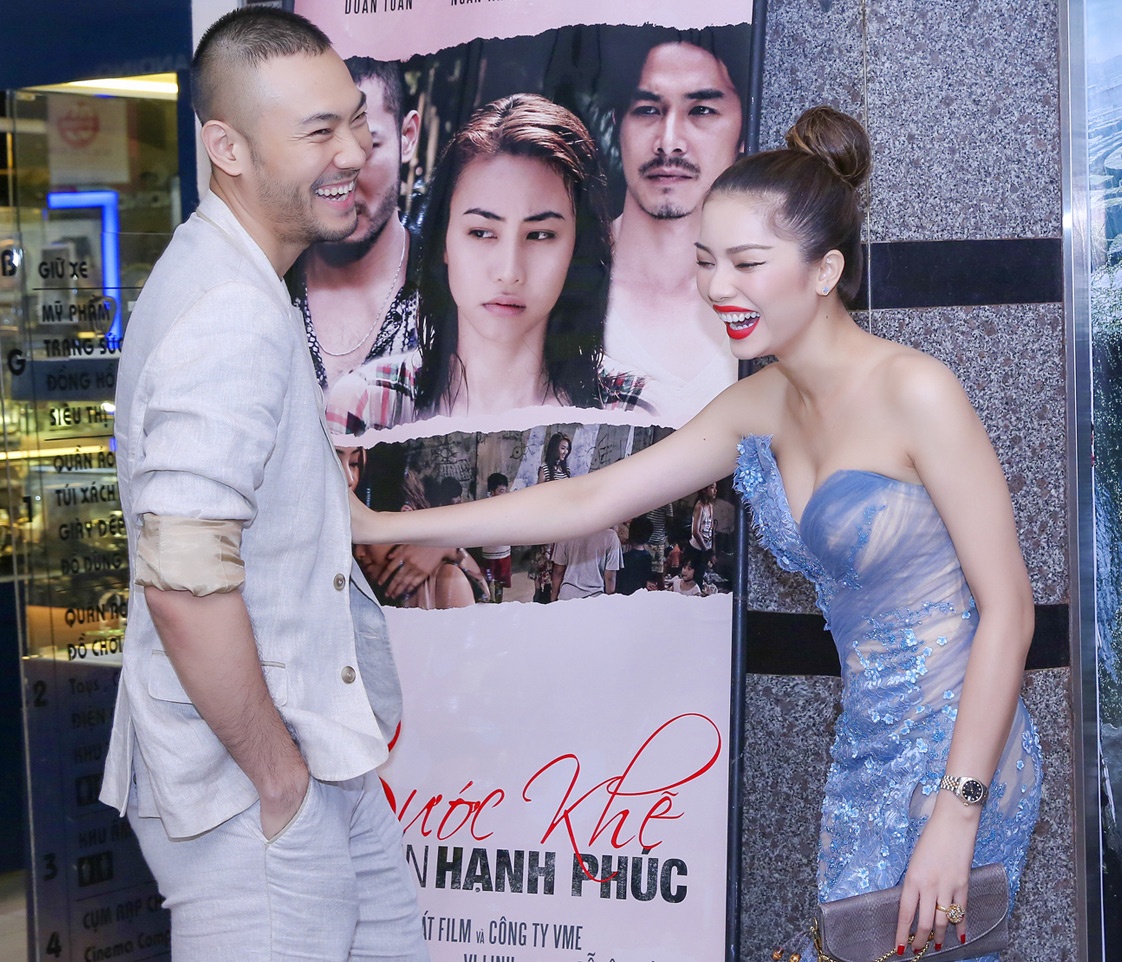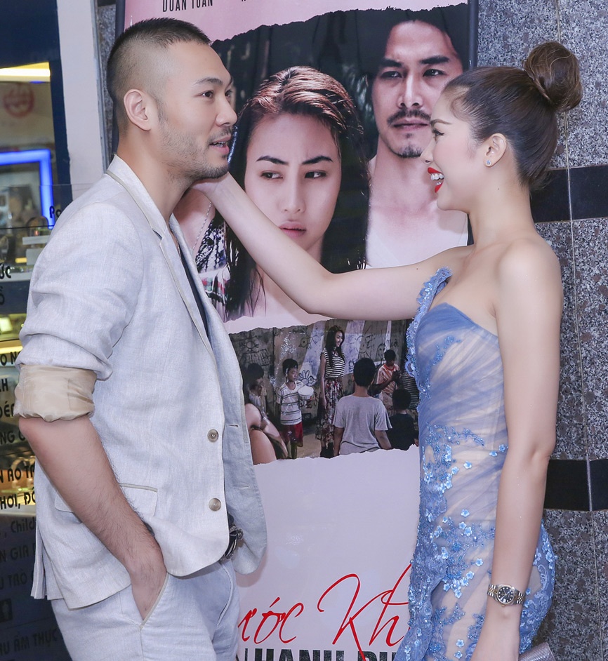 Nữ diễn viên "Tôi là ngôi sao" diện đầm sexy được ông xã Quỳnh Nga đưa đến buổi công chiếu phim "Bước khẽ hạnh phúc" do anh đóng vai nam chính.