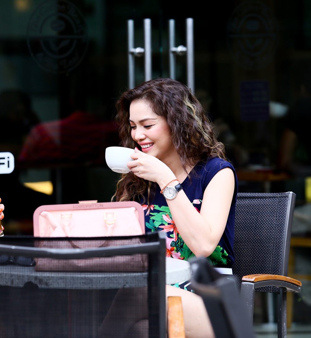 Nữ diễn viên đi uống cà phê, thư giãn cuối tuần bên người bạn thân. Cô khoe túi xách mới mua với bạn mình.