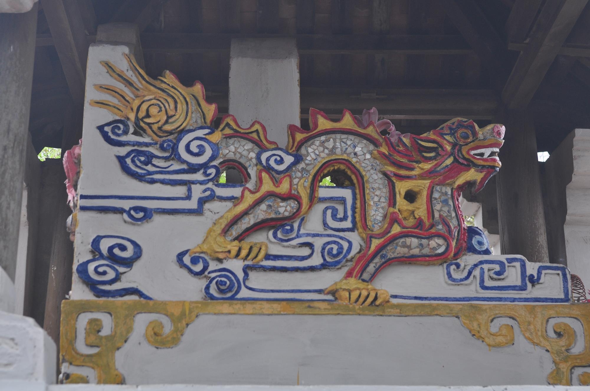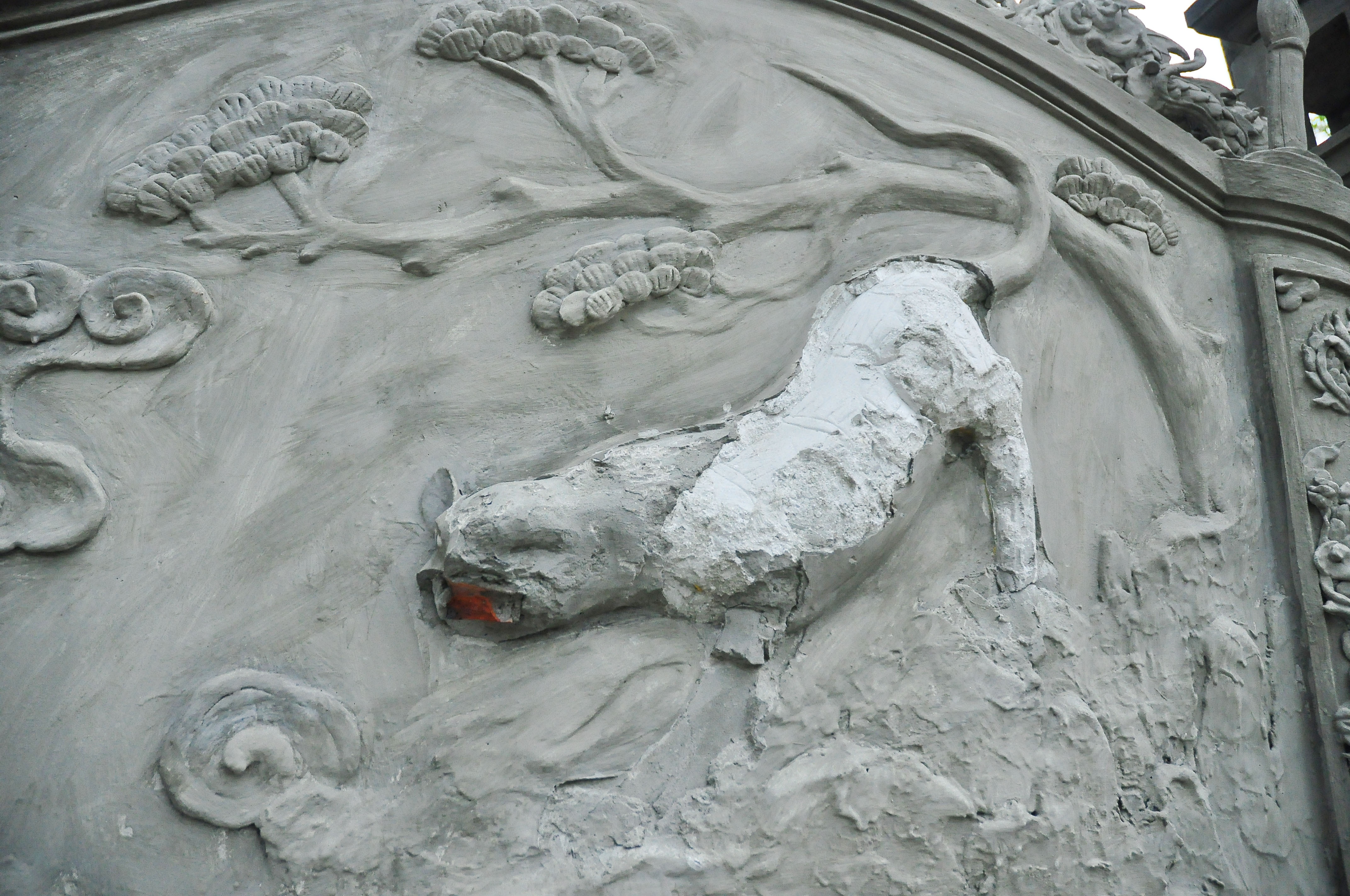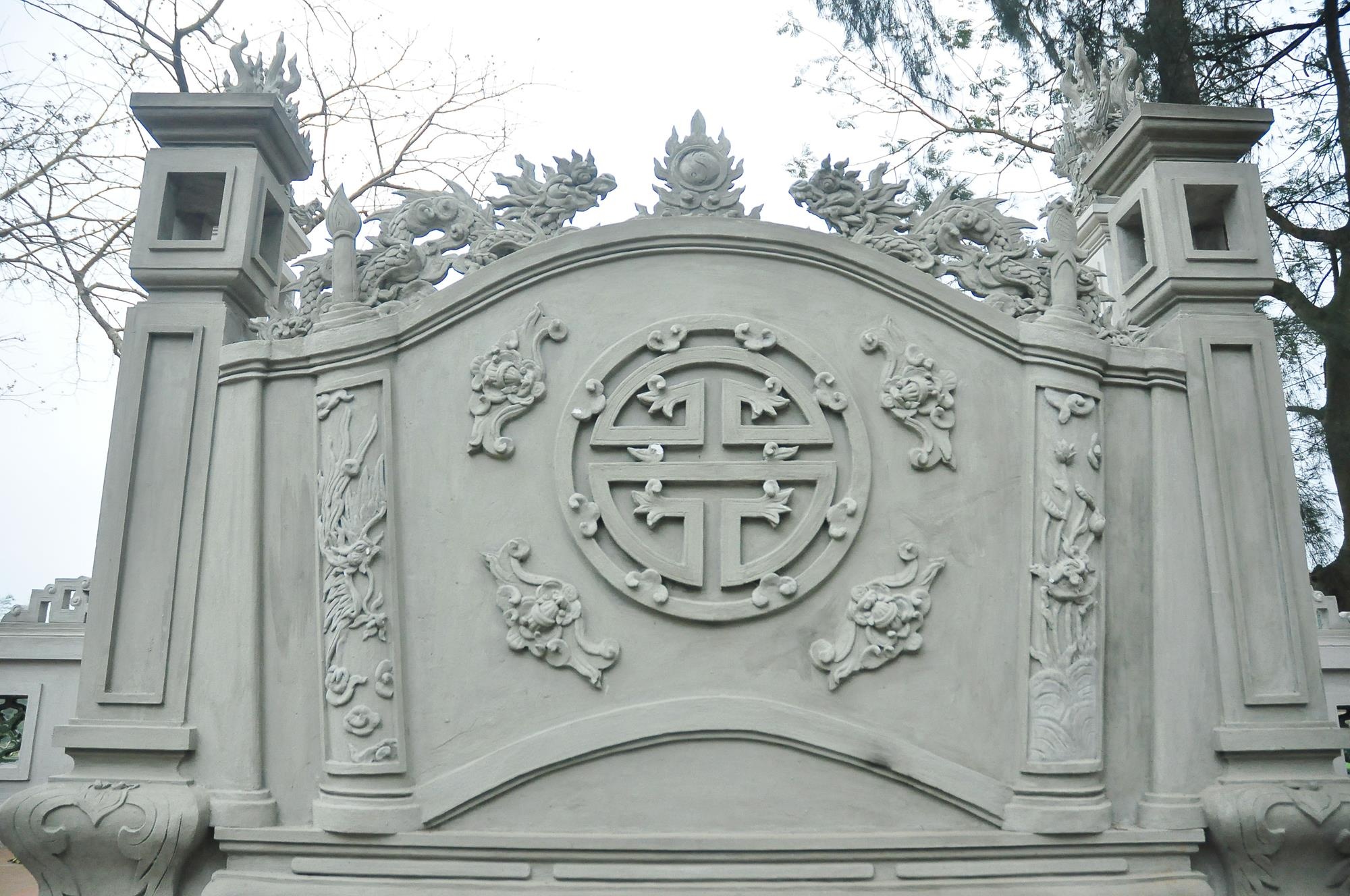 | Theo GS. Trần Lâm Biền, nhà nghiên cứu văn hóa Việt Nam, người tư vấn thiết kế công trình trùng tu lăng vua Ngô Quyền: "Vị trí bức bình phong đặt không hợp lý, chắn trước lăng vua. Mặt trước phải đắp ông hổ phục vằn có mặt và đuôi hướng ra ngoài trấn quỷ dữ. Mặt sau phải đắp tứ linh, hình rồng cuộn thủy, cá chép vượt vũ môn có ý nghĩa khát vọng sự phát triển thịnh vượng cho hậu thế". Trong ảnh, mặt sau bức bình phong trước lăng vua Ngô Quyền (thôn Cam Lâm, xã Đường Lâm, Sơn Tây, Hà Nội) không có gì đặc biệt. |