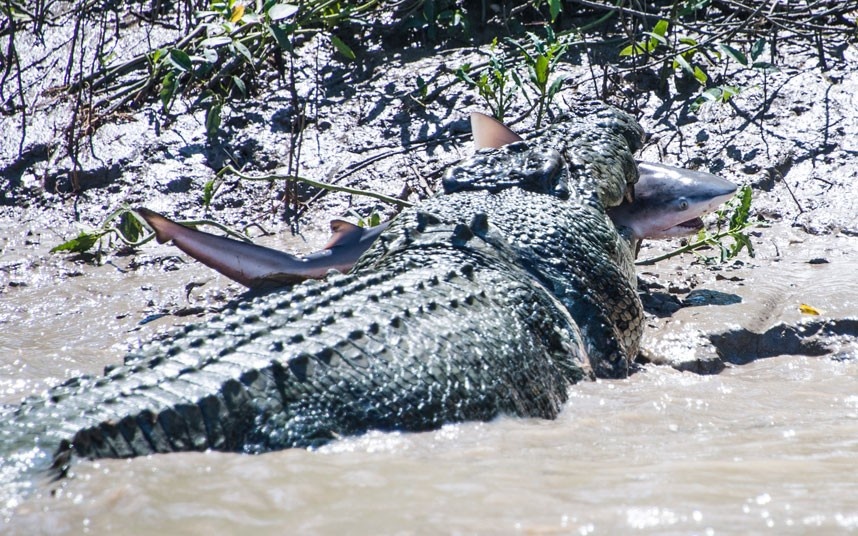 Con cá sấu nước mặn dài 5,5 mét dễ dàng hạ gục một con cá mập bò trước khi ăn thịt nó trên dòng sông Adelaide, công viên Quốc gia Kakadu, Australia. Andrew Paice, tác giả bức ảnh cho biết con cá sấu khoảng 80 năm tuổi. Những con cá mập bò là một trong những con mồi yêu thích của cá sấu nước mặn sống trên sông Adelaide. Ảnh: Getty |