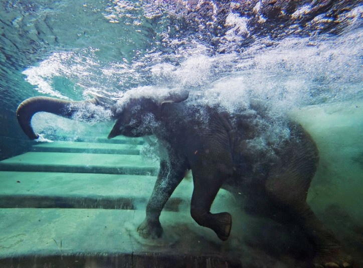 Voi con tập bơi ở vườn thú Leipzig, Đức. Người ta thiết kế một hồ bơi lớn ngay phía trước nơi ở của những con voi để chúng thoải mái đùa nghịch. Ảnh: AP |