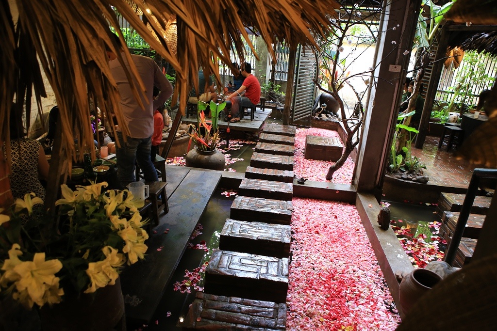 Quán được trang trí bởi thác nước nhân tạo đổ xuống từ tầng 3, kết hợp chậu cây và bình hoa tươi. Mặt ao được trải kín cánh hoa hồng, sen và bèo. Theo anh Thuân, quản lý, chi phí mua hoa mỗi ngày lên tới hơn 1,5 triệu đồng chưa kể 2 nhân công thu dọn vào cuối ngày. Tuy nhiên, nếu không có những điểm nhấn trên, quán không thể thu hút khách hàng.