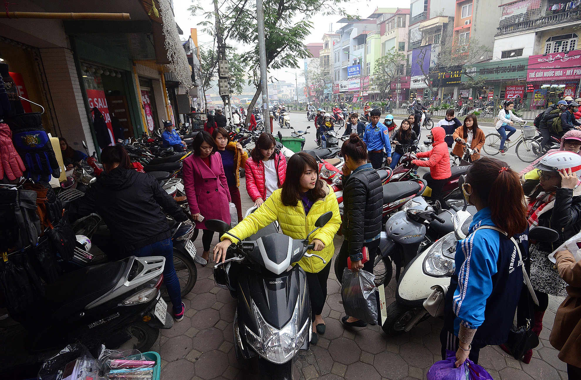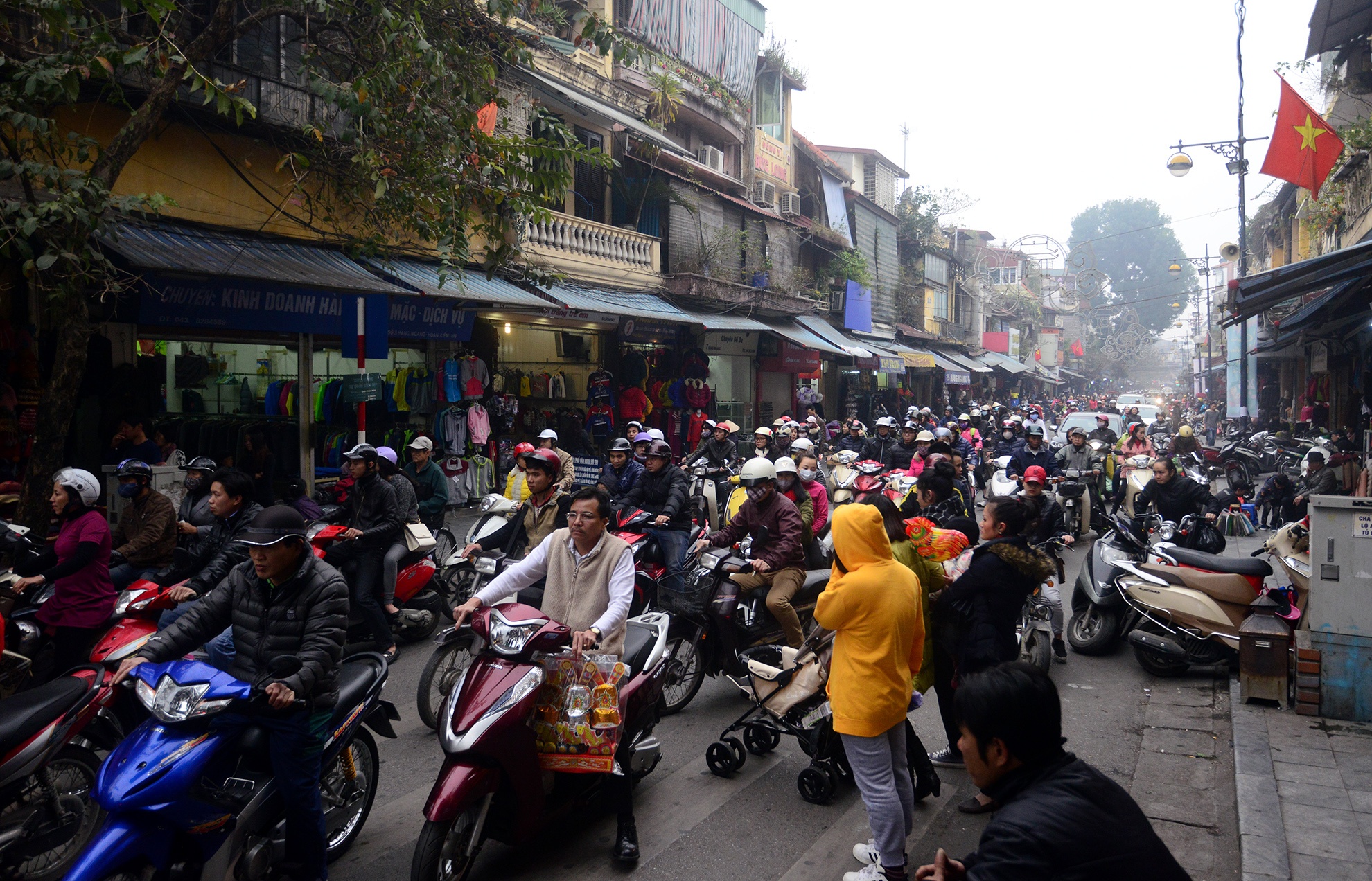 Trục đường Hàng Ngang, Hàng Đào giao thông luôn bị tắc nghẽn, bởi khách đổ về mua sắm hàng thời trang giảm giá.