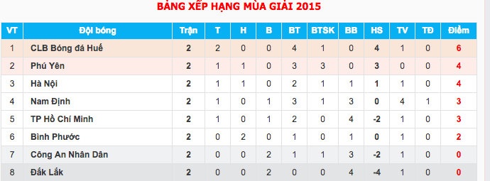 | Bảng xếp hạng giải hạng Nhất sau 2 vòng đấu. |
