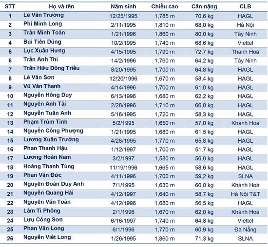Danh sách mới được bổ sung gồm các cầu thủ đến từ 8 lò khác nhau là HAGL-Arsenal JMG, Hà Nội, Viettel, Thanh Hóa, Tây Ninh, Khánh Hòa, Đà Nẵng và Hà Nội-T&T. Mặc dù chiếm đến 1/2 quân số, nhưng "gà" của bầu Đức cho thấy thể hình hạn chế so với các cầu thủ cùng trang lứa khác.