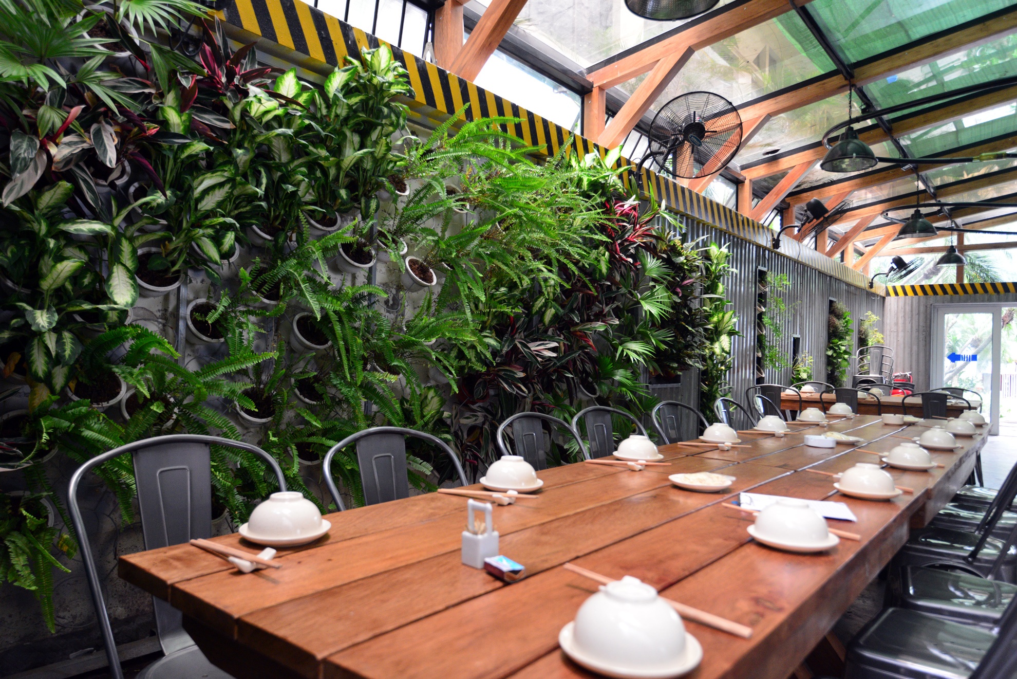 | Cột gỗ, bàn gỗ được sử dụng trong không gian nhà hàng, trần làm từ sắt. Đặc biệt, kiến trúc sư đã sử dụng kính lợp hoặc tạo mái nghiêng cho nhà hàng nhằm tận dụng ánh sáng tự nhiên. |