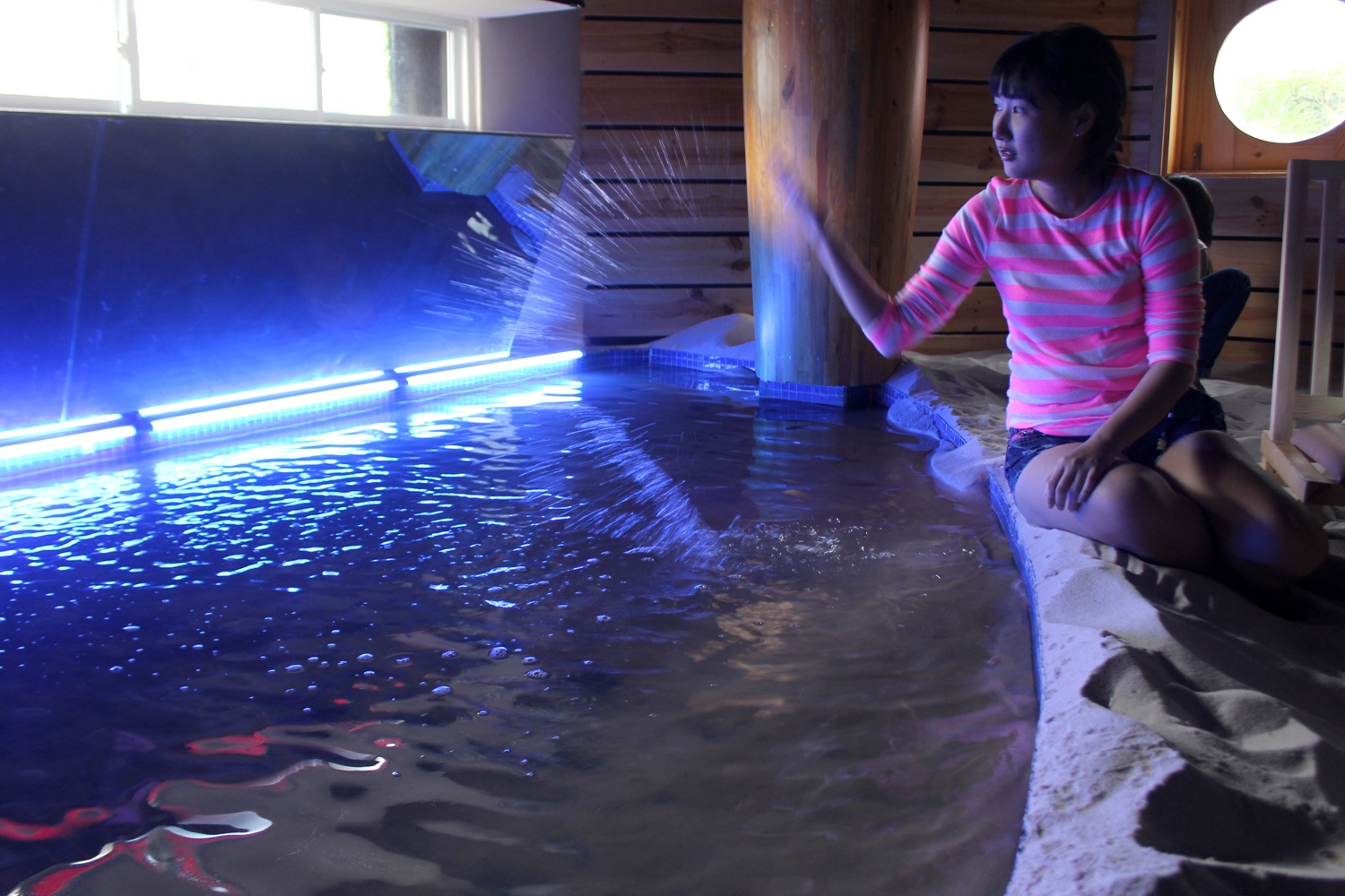 | Việc vệ sinh cho bãi biển trong nhà cũng khá công phu. Hàng ngày, nhân viên phải nhặt sạch rác, múc cát từ dưới hồ lên và tạo lại cảnh quan để đón khách. |