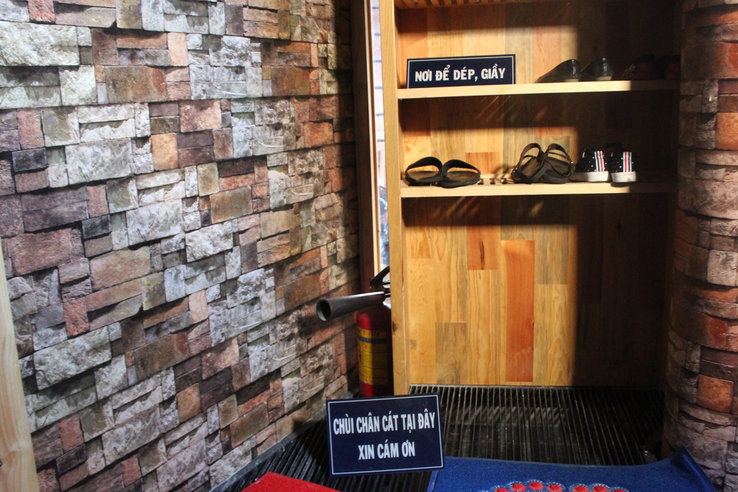 | Trước khi vào phòng, khách phải bỏ giày, dép bên ngoài để không làm bẩn cát. Sau khi ra khỏi quán, khách cũng phải chùi chân sạch. |