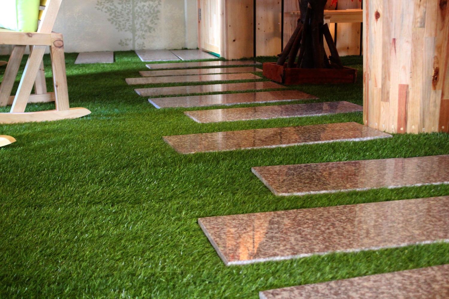 | Ngoài bãi biển, quán còn có phòng theo phong cách thiên nhiên cây xanh. Nền nhà được lót cỏ nhân tạo với những miếng đá hoa cương làm lối đi. |