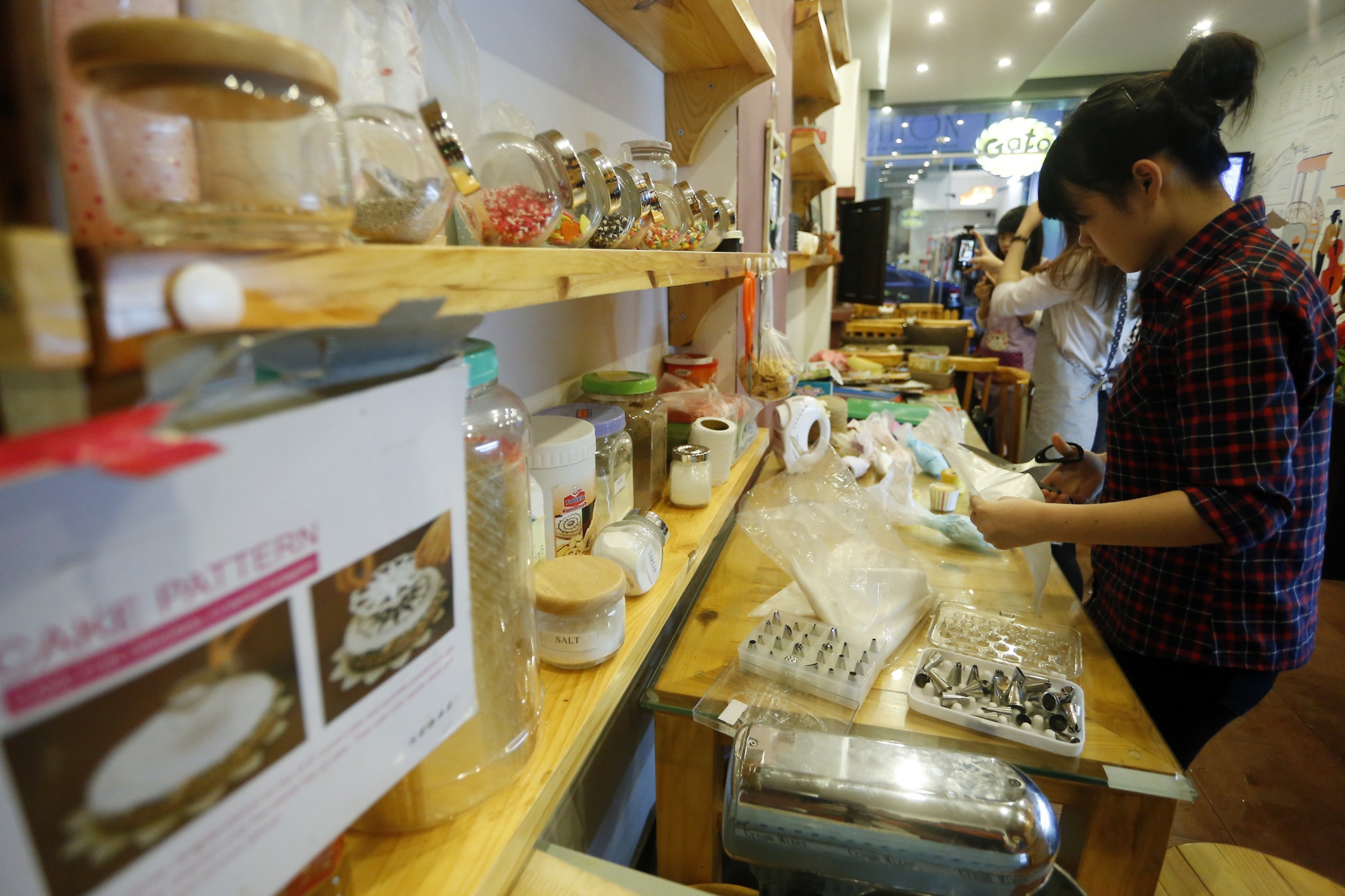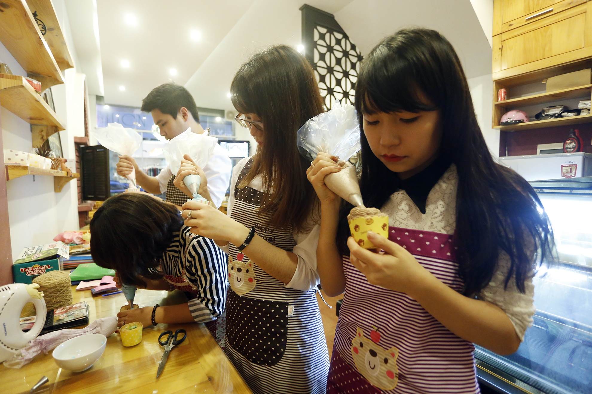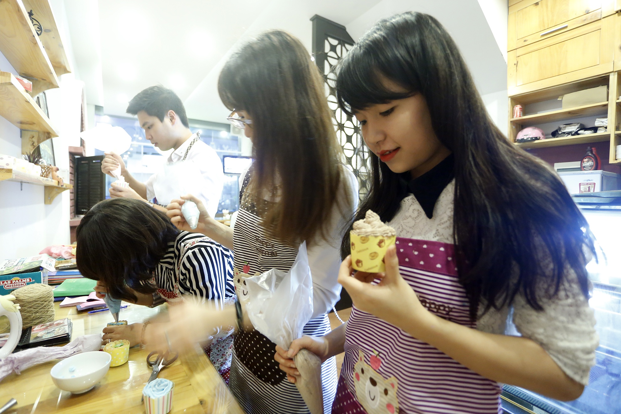 | Tại Hà Nội, chưa có nhiều quán cà phê kinh doanh dịch vụ cho khách tự làm bánh. Vì thế, địa điểm nói trên tại phố Hạ Hồi khá thu hút. |
