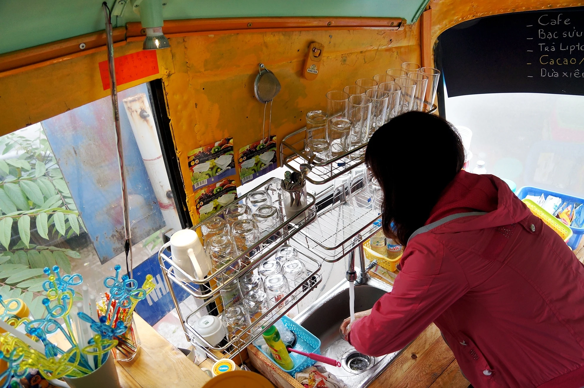 Khu vực vô lăng được cải tạo thành khu pha chế đồ uống, vệ sinh cốc chén.