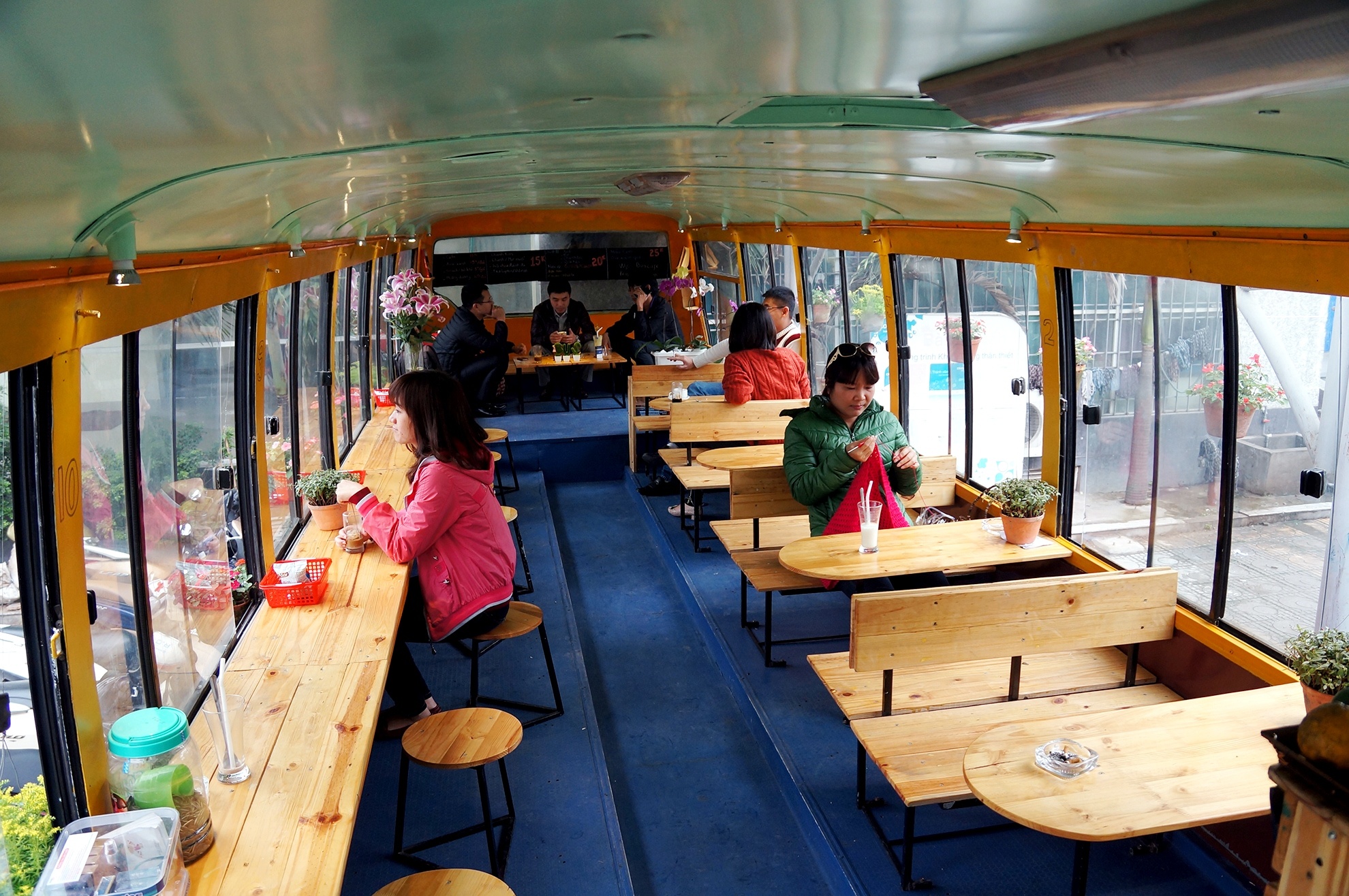 Uống cà phê trên xe bus - phương tiện di chuyển quen thuộc của học sinh, sinh viên - đem đến cho nhiều khách cảm giác thân thiện. Nhờ thiết kế đặc trưng của xe bus, khách vào quán dễ dàng tìm được một chỗ ngồi thoải mái, quan sát không gian xung quanh qua lớp kính.