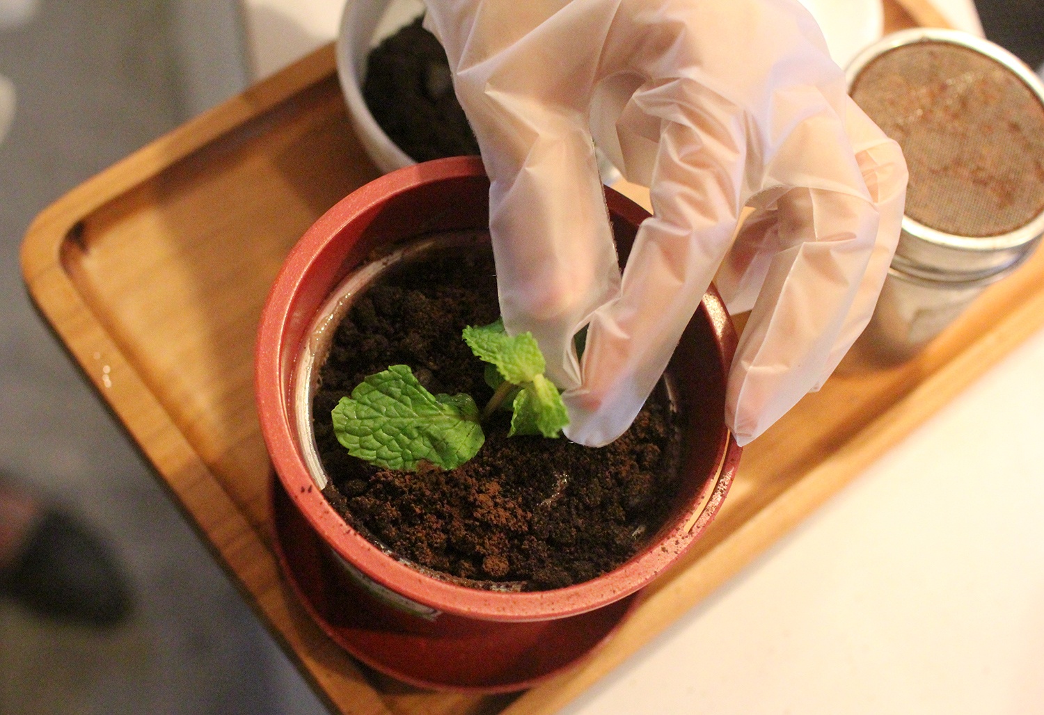 | Nguyên liệu để làm nên "chậu cây" khá đơn giản. Chủ quán đã sử dụng những loại bánh có màu sắc gần giống với đất trồng cây để làm kem, điểm thêm rau húng thơm làm mầm cây. |