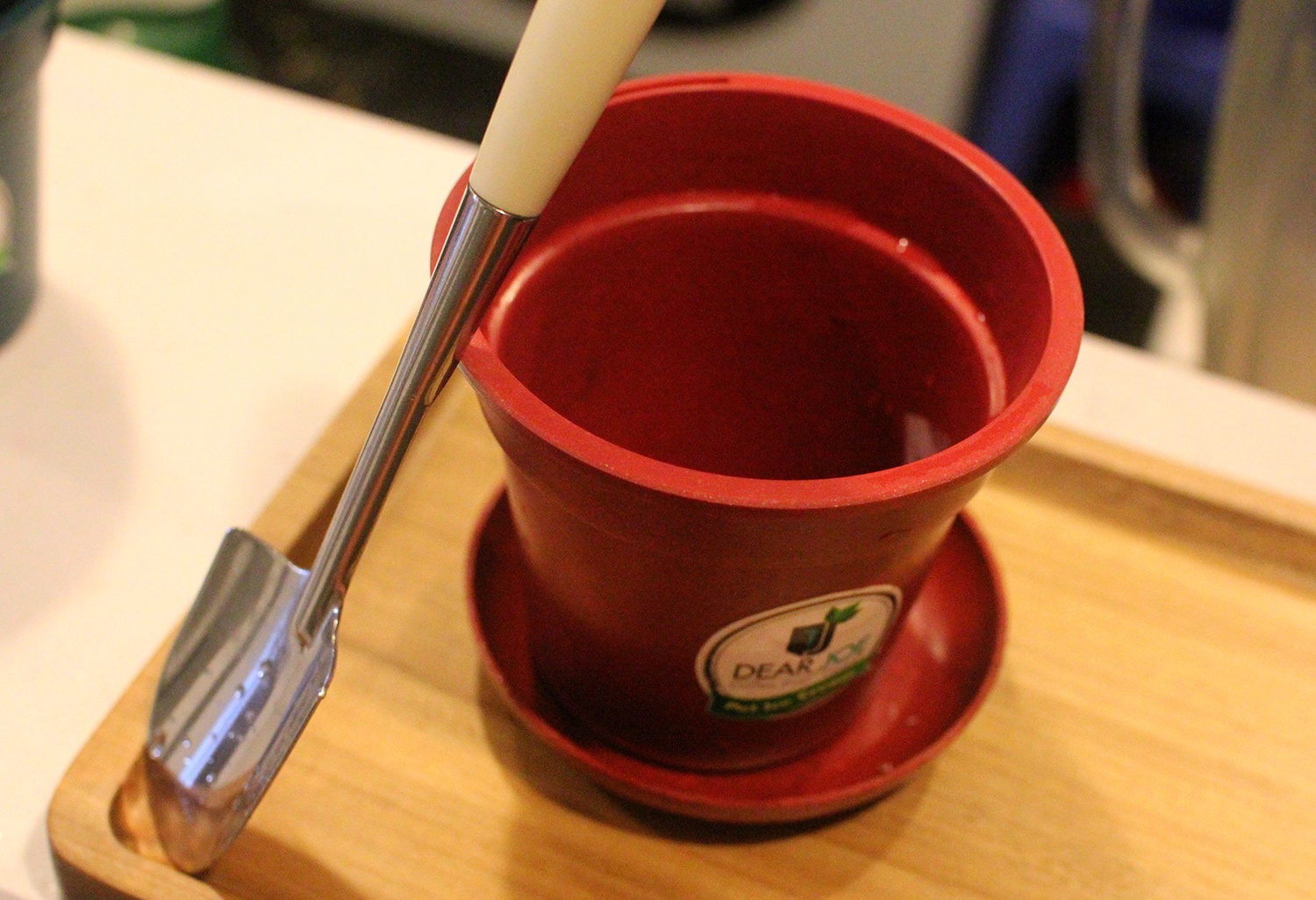 | Chậu cây và muỗng hình giá xúc đất này được chủ quán nhập từ Nhật, với giá mỗi bộ 120.000 đồng. |