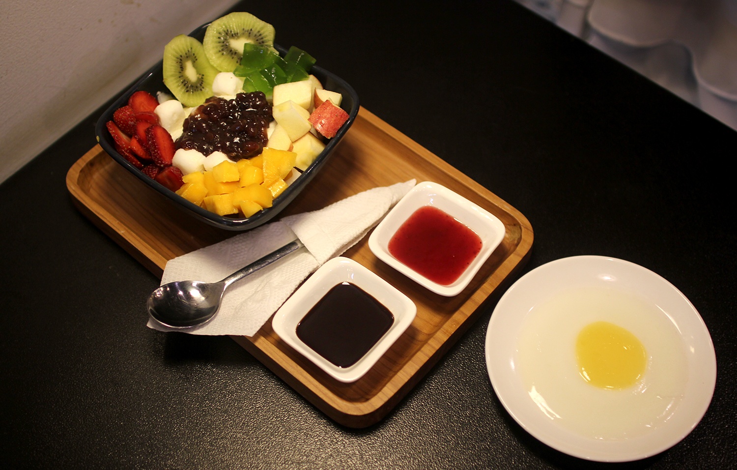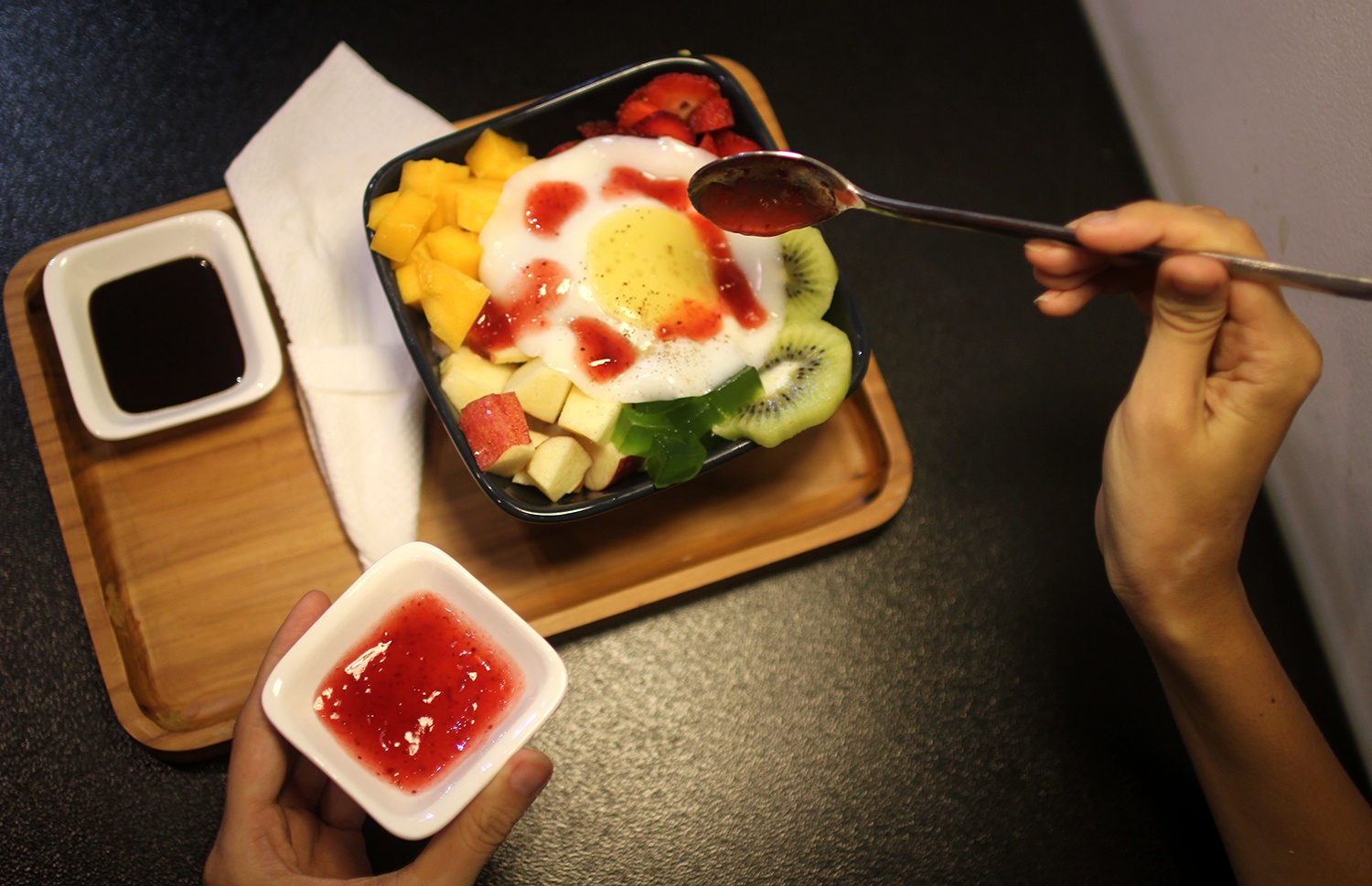 Quán còn có món "cơm trộn" chế biến hoàn toàn bằng trái cây, nhưng nhìn rất giống món ăn mặn. Đặc biệt là trứng ốp la được làm từ rau câu.