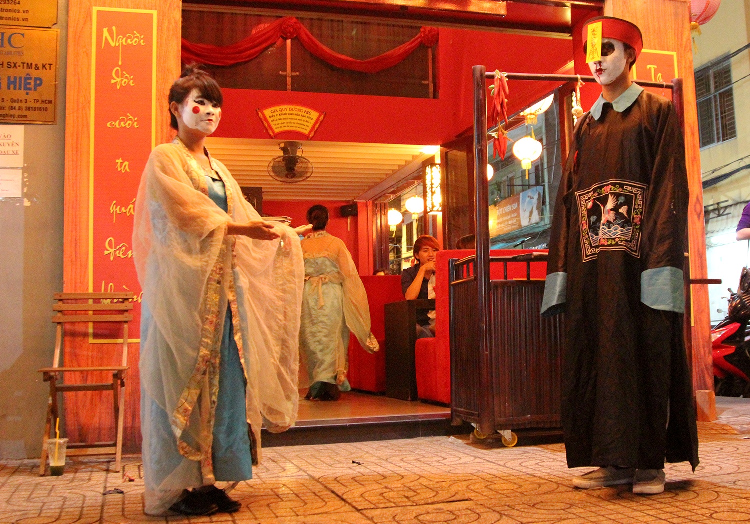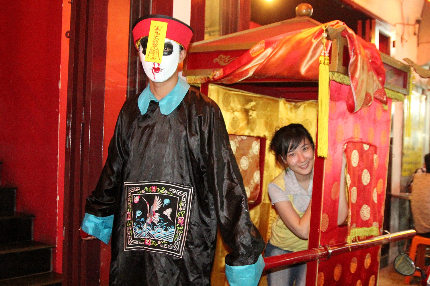 | Ngoài hóa trang cho nhân viên, quán còn trang bị cả một chiếc kiệu để làm phụ kiện chụp hình cho khách. Phần lớn khách đến đây, ngoài để ăn uống, còn có mục đích chụp được một tấm hình độc đáo cho dịp Halloween. |