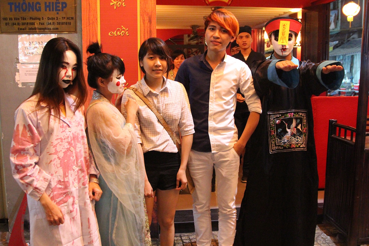 | Nằm trên đường Nguyễn Trãi, quận 5, TP.HCM, quán thu hút người đi đường bởi những nhân viên vào vai cương thi đứng trước cửa để chào đón khách hàng vào tối Halloween. |