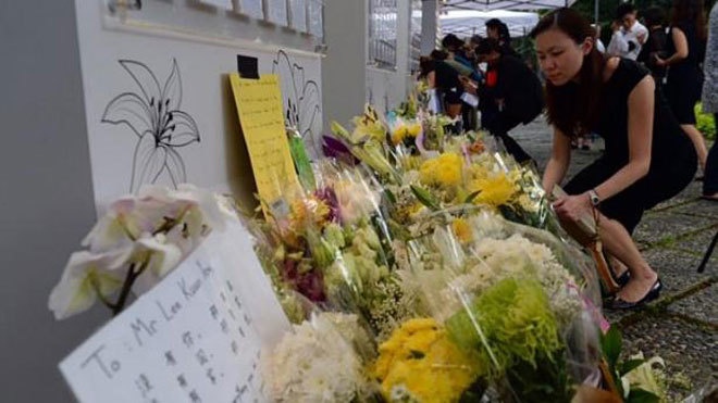 | Trong khi đó, người dân xếp hoa và thiệp chia buồn bên ngoài dinh Istana. Sự ra đi của ông Lý Quang Diệu là nỗi mất mát to lớn đối với người dân Singapore. |