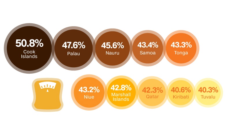 Tỷ lệ người béo phì ở các đảo dao động từ 35% tới 50%. Riêng ở quần đảo Cook, số người béo phì chiếm hơn 50% dân số. Tình trạng thừa cân được ví như “bệnh dịch chết người” ở đây. |