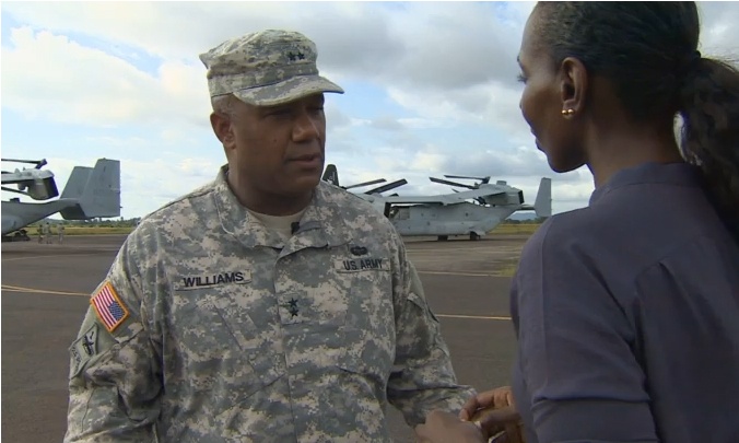 Thiếu tướng Darryl Williams, chỉ huy quân đội Mỹ ở châu Phi, đứng đầu lực lượng Mỹ tham gia cuộc chiến chống virus Ebola ở Liberia. Khác với những cuộc chiến bằng súng ống và bom đạn, tướng Williams và thuộc cấp mang tới ổ dịch Ebola ở Tây Phi các dụng cụ y tế nhằm ngăn ngừa dịch bệnh. Ông nhận lệnh trực tiếp từ Tổng thống Barack Obama, Tổng tư lệnh quân đội Mỹ. Ảnh: CNN