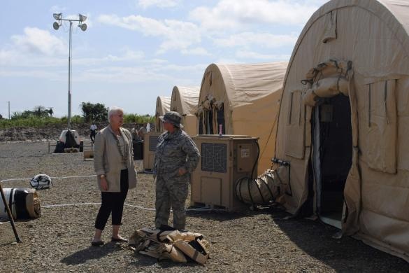 Đại sứ Mỹ tại Liberia Deborah Malac (trái) đứng trước khu lều trại mới được xây dựng để phục vụ các nạn nhân của Ebola gần sân bay Roberts. Ảnh: Reuters