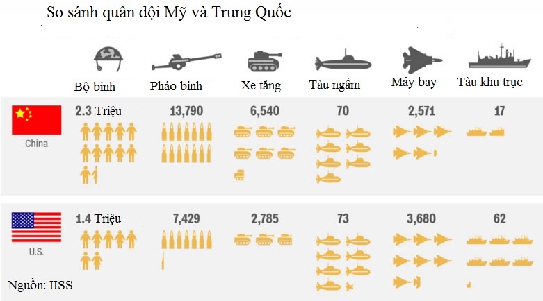 | Cán cân quân sự Mỹ-Trung qua những con số. Ảnh: IISS |