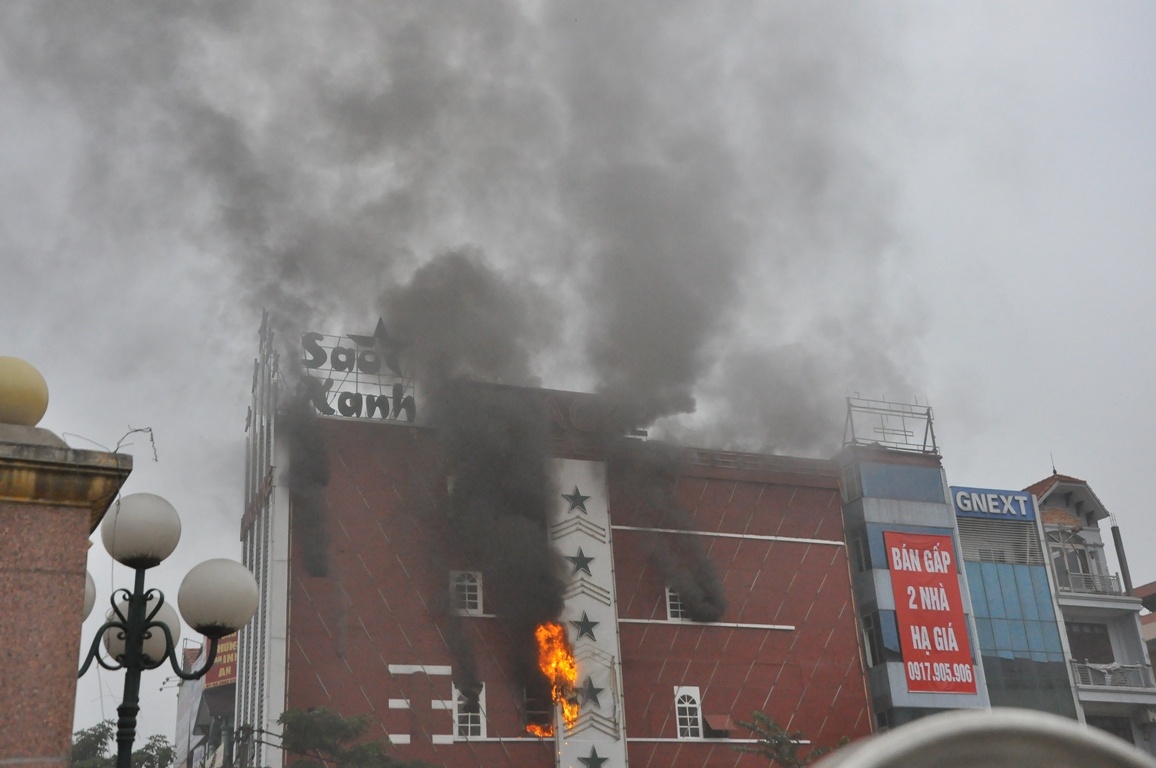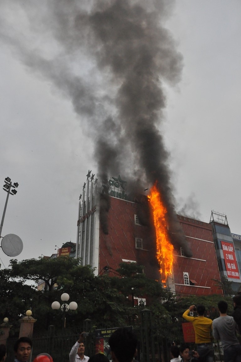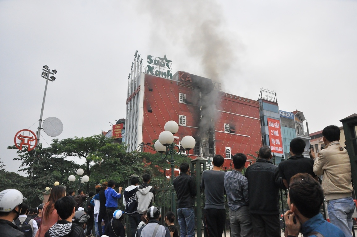 | Khoảng 16h chiều 15/11, quán karaoke Sao Xanh, sát với nhà hát quân đội ở ngõ 31 Hồ Tùng Mậu (Cầu Giấy, Hà Nội) bốc cháy dữ dội. |