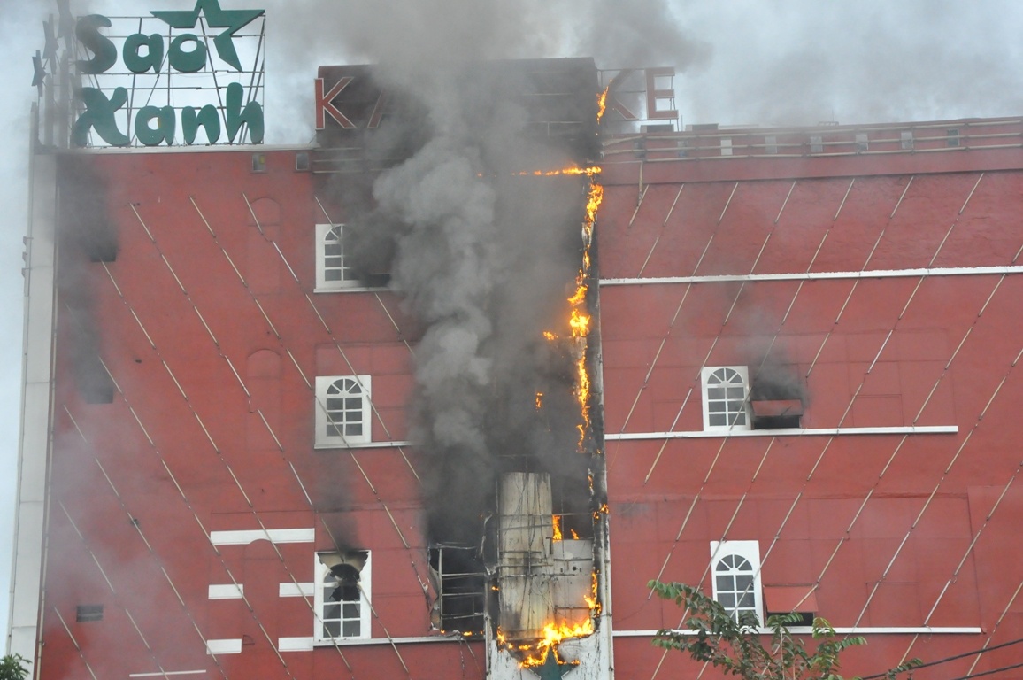 | "Lúc đó, tôi chỉ biết chạy lên thông báo.. Khách ở tầng 3, tầng 4 chạy vội xuồng tầng 1. Một số ở tầng 4, tầng 5 không kịp chạy xuống đã leo lên tầng thượng sang nhà bên cạnh", Nam nói. Anh này biết thêm, mỗi tầng có 4 phòng hát được bố trí đối xừng nhau. Trong phòng, có nhiều vật liệu dễ cháy như ghế sofa, trần thạch cao, mút xốp... nên khi cháy tạo ra khói đen. Nhiều khách bị ngạt nhưng rất may được mọi người dìu ra ngoài. |