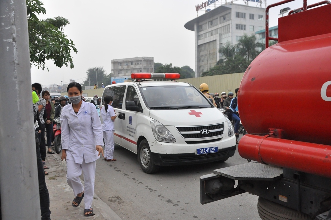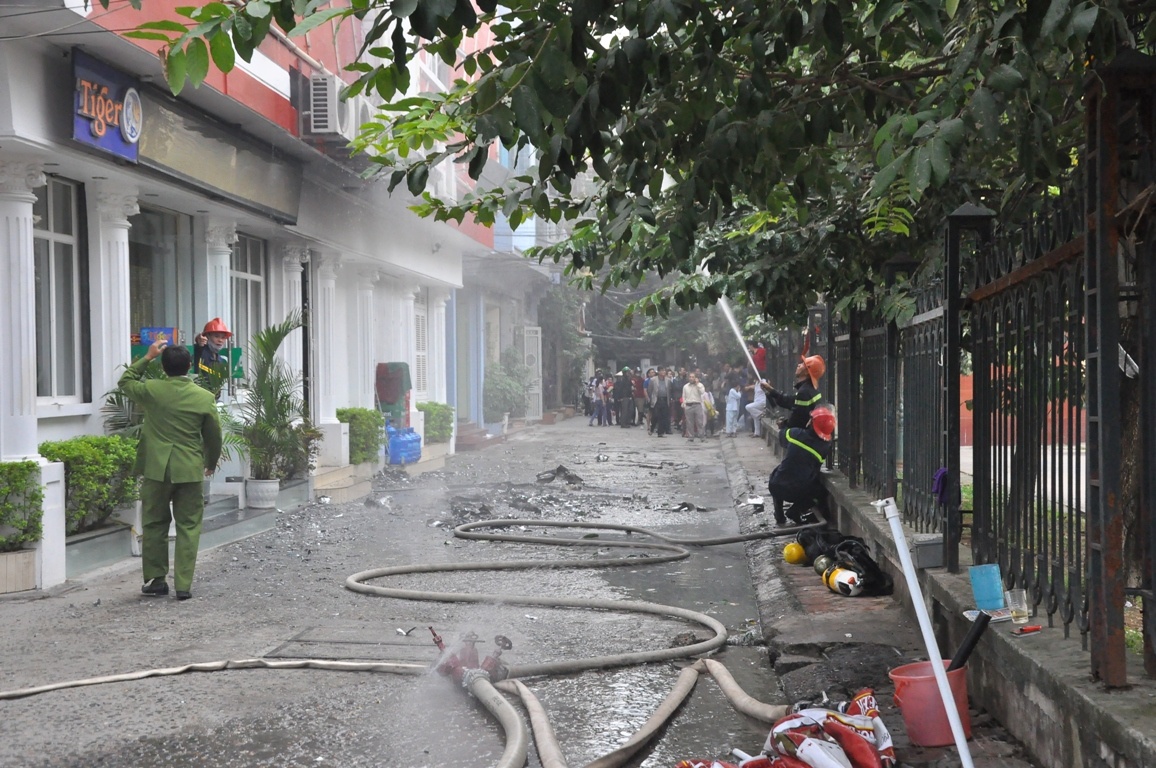 | 5 xe cứu hỏa nối đuôi từ đầu ngõ vào. Chiếc xe thang được điều động vào sân nhà hát quân đội dùng vòi rồng phun nước qua hệ thống cửa kính của ngôi nhà 5 tầng để chữa cháy. Nhân viên y tế của lực lượng cấp cứu 115 tới ngay sau đó. |