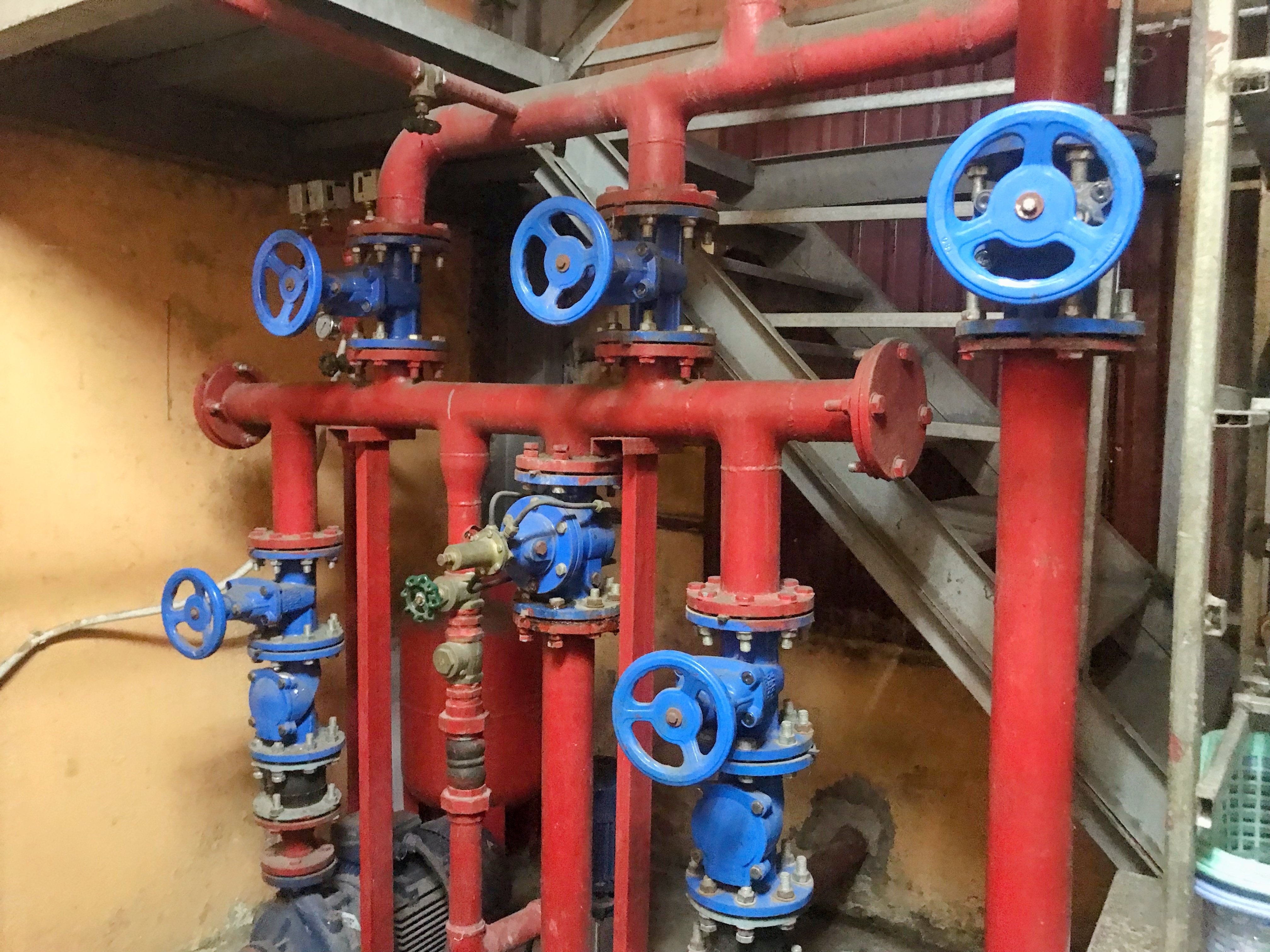 | Hệ thống phòng cháy chữa cháy trong một quán karaoke trên phố Trần Thái Tông bao gồm: Đường dây bơm nước cho chín tầng, tủ báo cháy tự động, tủ điện máy bơm, thang thoát hiểm ngoài trời. Ảnh: Vân Trang. |