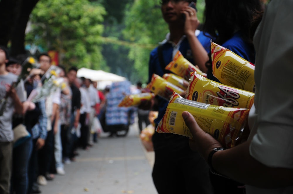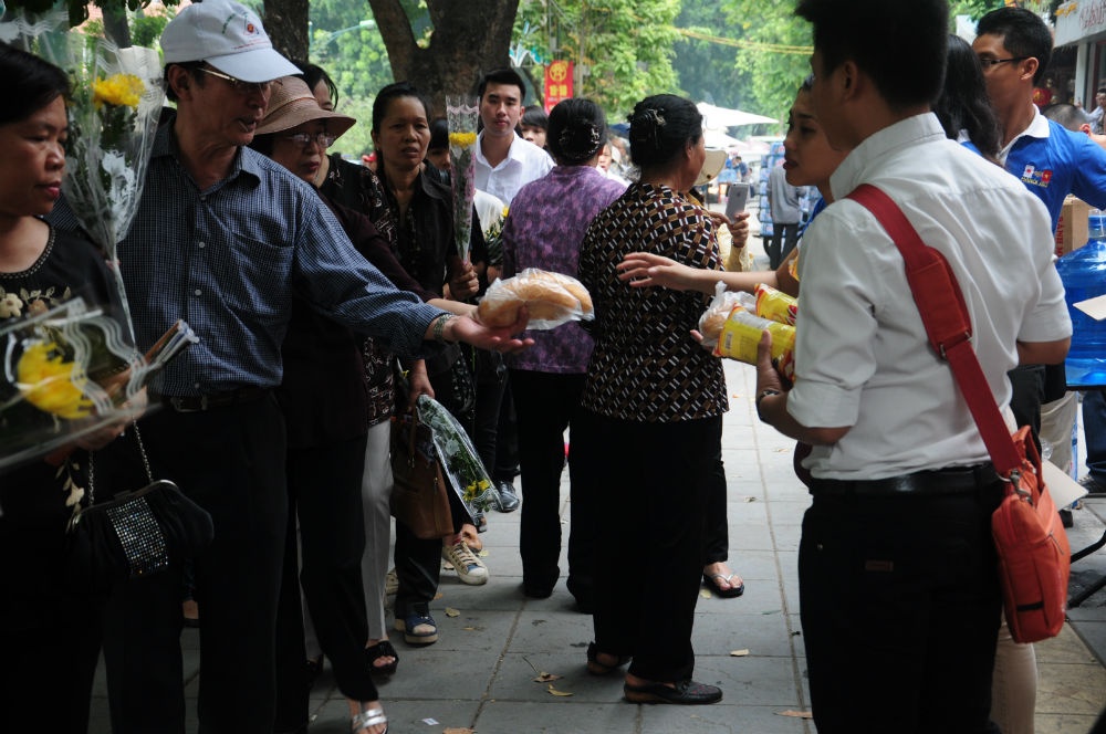 Nhiều người biết trước phải chờ nhiều giờ nên đã mang theo cơm nắm, cơm hộp và lương thực dự bị để đủ sức đợi đến lượt mình thăm viếng.