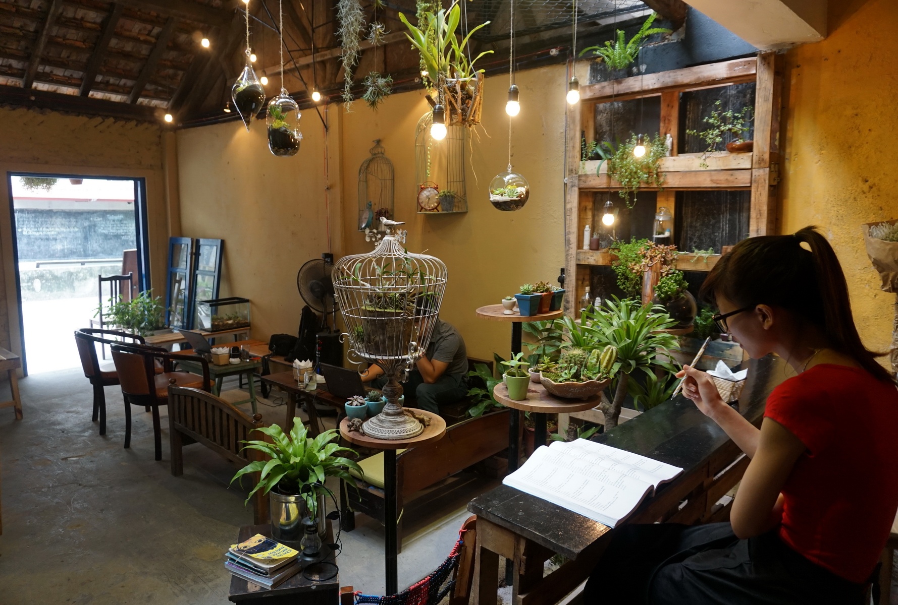 Quán cà phê độc đáo của kiến trúc sư Nguyễn Tiến Dũng nằm trong khu tập thể khá yên tĩnh trên phố Lê Thánh Tông (Hà Nội). Chủ quán chia sẻ, dù mới mở được 1 tháng nhưng hiện tại lượng khách tới quán mỗi ngày tương đối. Vào các buổi trưa và tối, mặt bằng 60 m2 của quán thường xuyên chật kín khách, thậm chí quá tải. Tiến Dũng cho biết, phần đông khách tới quán không hẳn do đồ uống mà nhờ không gian tự nhiên và những tiểu môi trường xanh trong những bình thủy tinh đủ hình dáng, kích cỡ treo khắp không gian. |