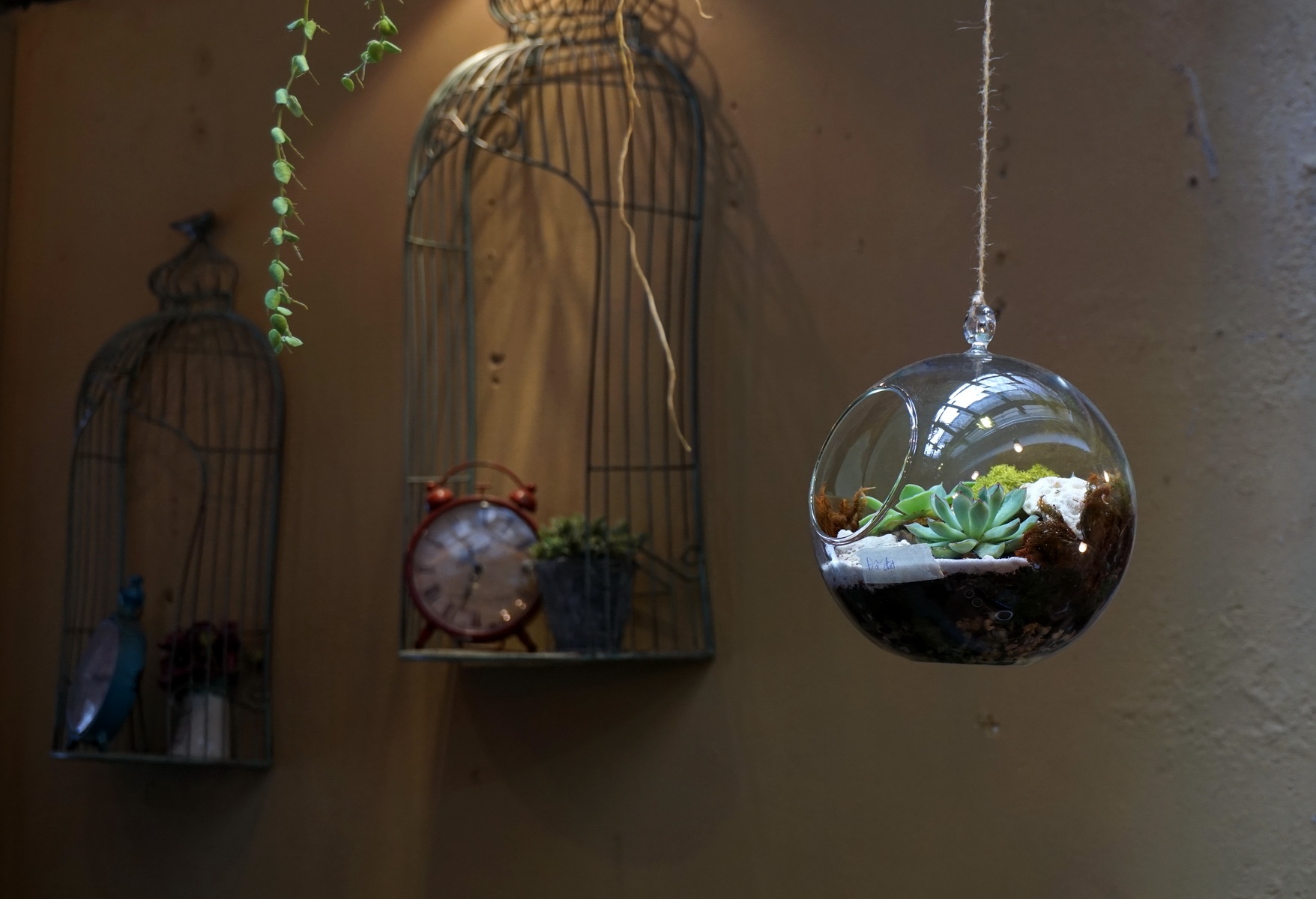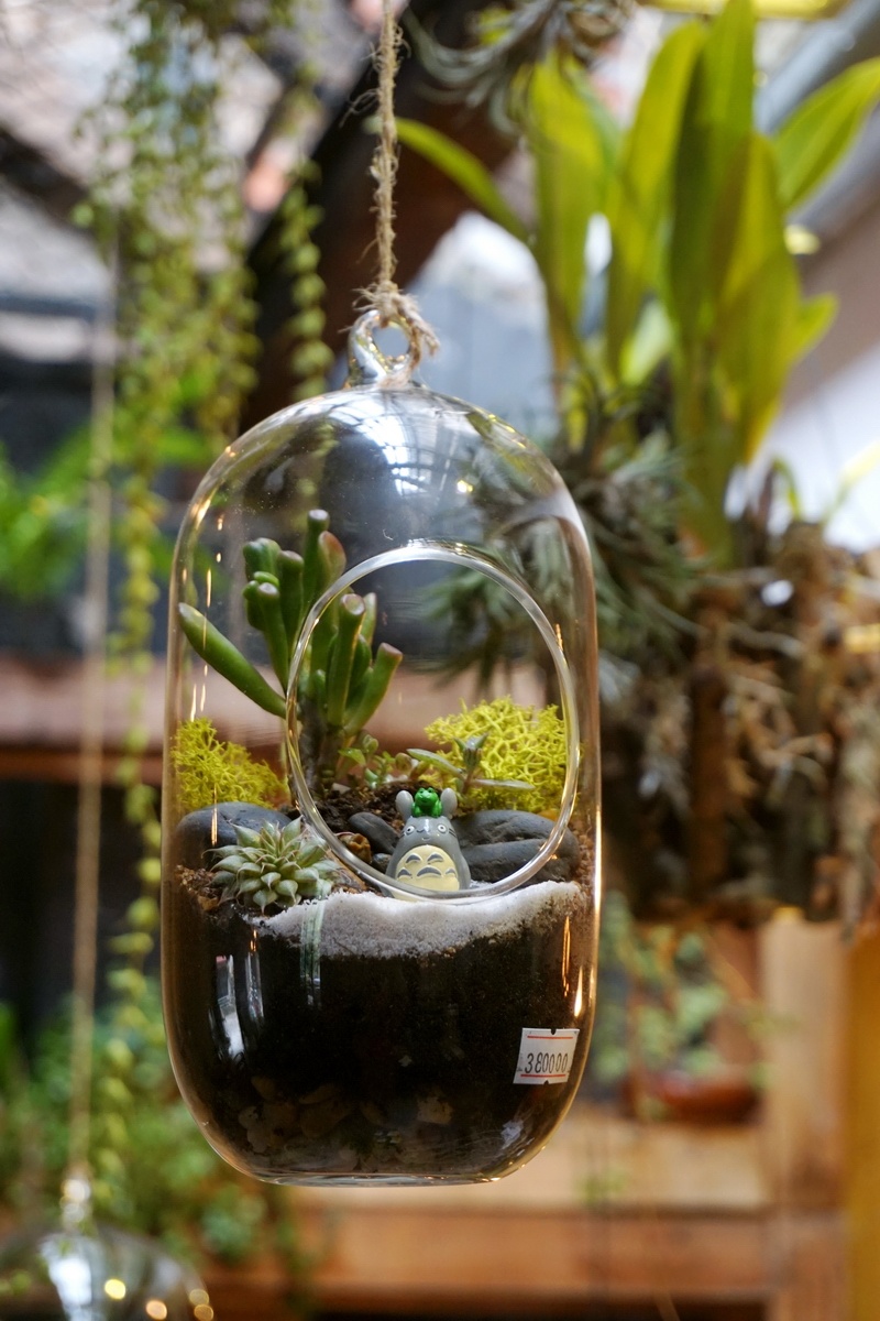 Tùy vào sự đam mê và khả năng sáng tạo của người chơi mà mỗi tiểu môi trường được tạo dựng theo nhiều phong cách khác nhau. Chị Hải Hà (nhân viên truyền thông, Lý Thường Kiệt, Hà Nội) cho biết, chị mê mẩn những quả cầu thủy tinh xanh này ngay từ khi được một người bạn tặng trong ngày sinh nhật. Chị tìm tới quán giải khát này để học hỏi chủ nhân cách chơi cây Terrarium. |