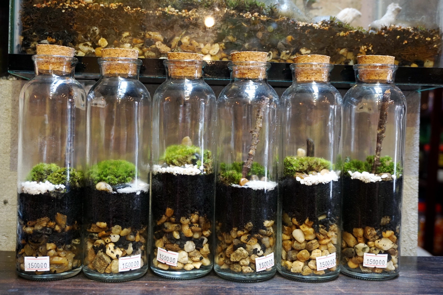 Mỗi bình cây Terrarium có nhiều mức giá, dao động 100.000 - 400.000 đồng, tùy kích cỡ và độ phức tạp, cầu kỳ. Các nguyên liệu tạo nên những tiểu môi trường này bao gồm loại cây phù hợp, đất dinh dưỡng, sỏi, phụ liệu tạo tiểu cảnh và thứ không thể thiếu là bình thủy tinh. Riêng bình thủy tinh có giá bán riêng khoảng 100.000 - 200.000 đồng/bình. |