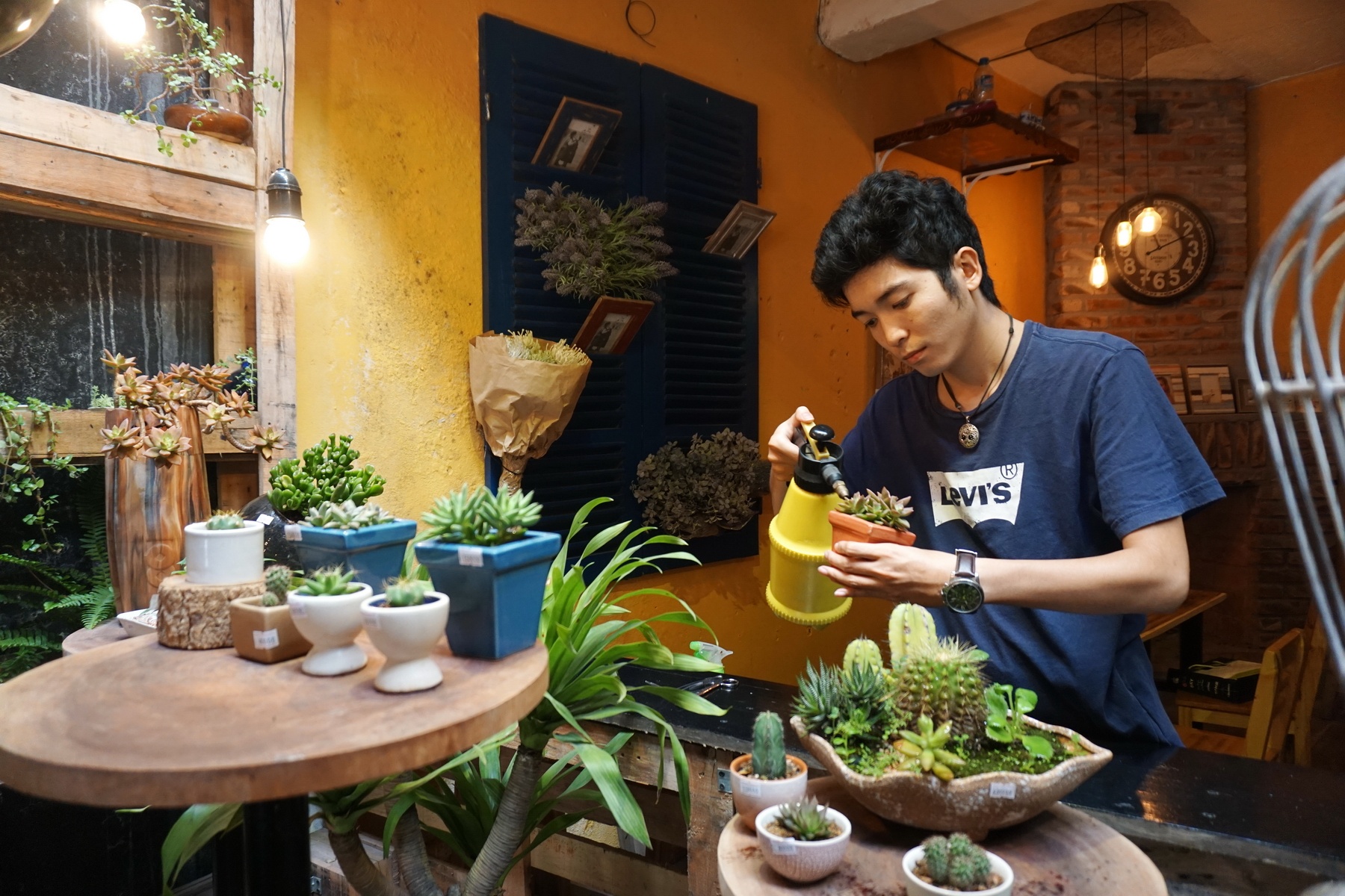 Dũng đặc biệt yêu thích những cây cảnh loại nhỏ và siêu nhỏ. Anh sưu tầm rất nhiều loại cây và tự kết hợp, thiết kế chúng tạo thành những tiểu môi trường cây xanh đẹp, dễ thương. |