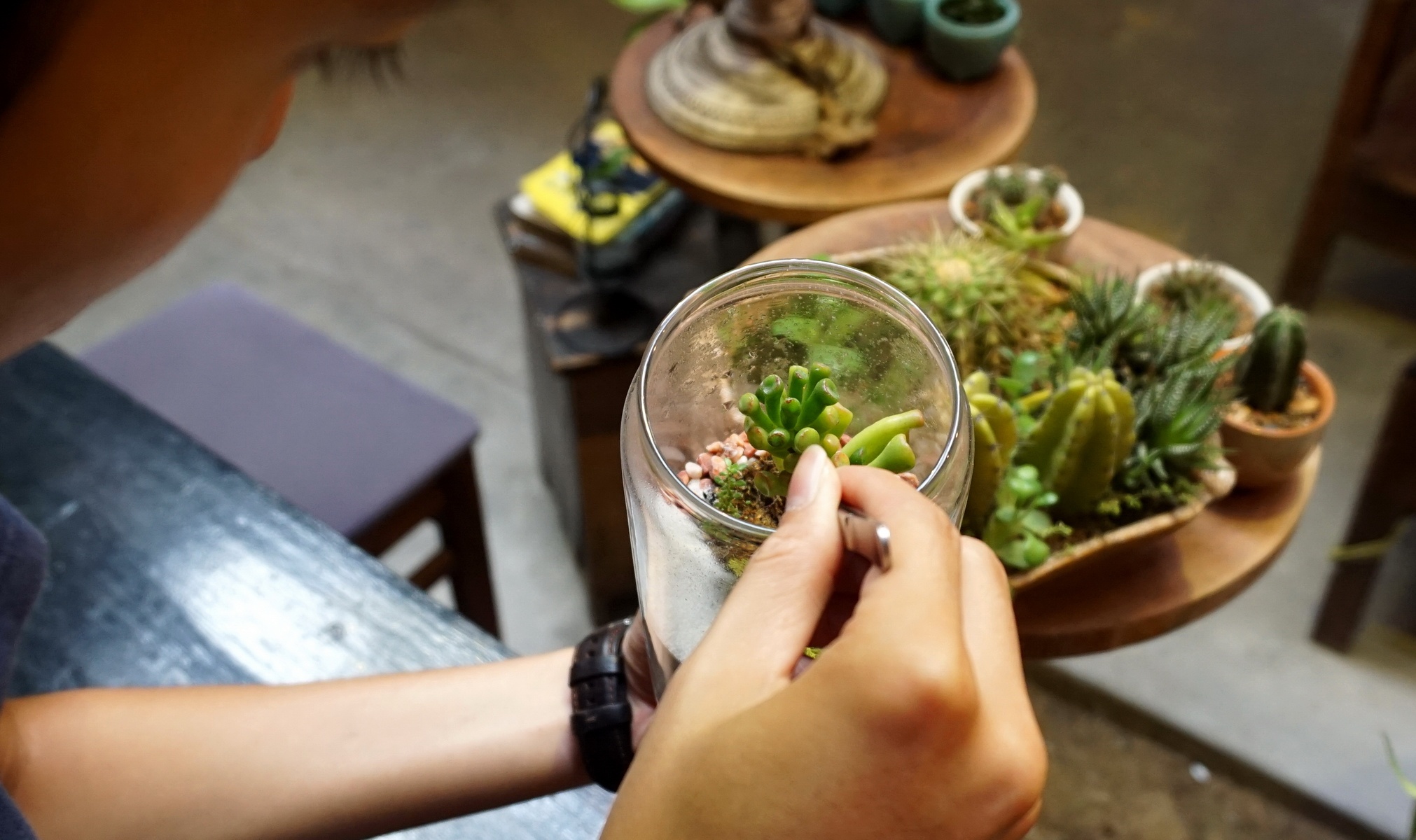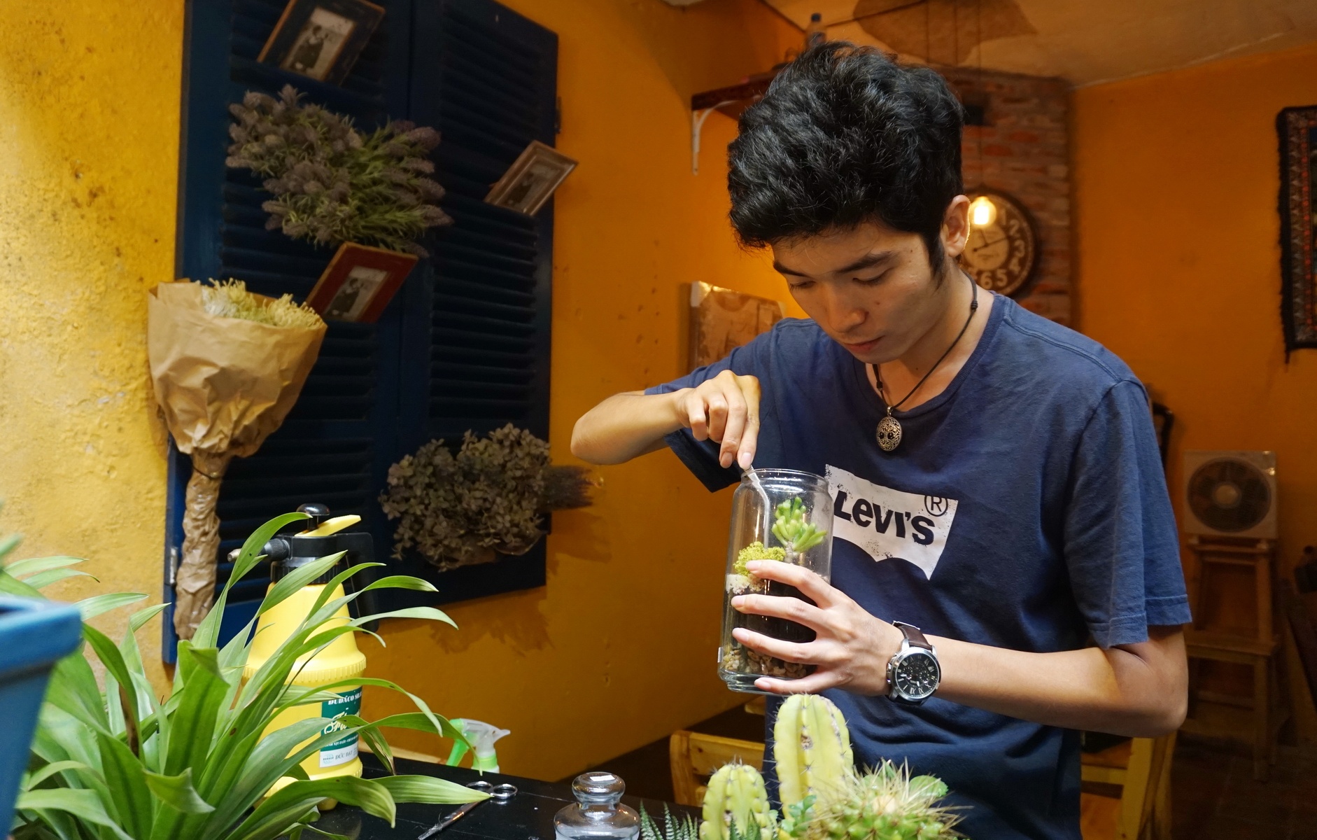 Tạm ngưng công việc thiết kế để đầu tư cho sở thích cá nhân, Dũng từng có gần 1 năm chơi cây Terrarium. Thời gian đầu, anh tập tành làm những tiểu môi trường xanh trong các bình thủy tinh đủ hình dáng, kích cỡ để tặng bạn bè. Sau đó, được nhiều người ủng hộ, Dũng chuyển sang làm bán, vừa có tiền đầu tư cho đam mê, vừa có điều kiện lan tỏa sở thích riêng hữu ích tới cộng đồng. |