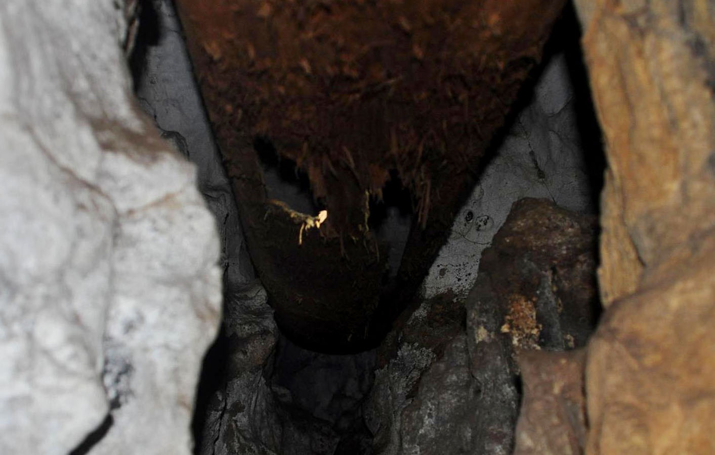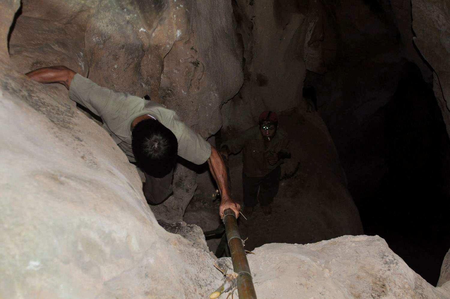 Cả đoàn chưa kịp lấy lại sức, ông Nghìn nhanh nhẹn thắp nén hương ở cửa hang với lời khấn bằng tiếng địa phương. Còn ông Tình dùng dao rựa chặt hai thân mai to khỏe nhất, róc hết mắt để làm thang xuống hang. Lúc này, trong bi-đông còn bao nhiêu rượu, ông Nghìn chia đều cho 4 người uống hết và bật đèn pin dẫn cả đoàn vào hang. Bước qua hốc đá chắn trước miệng hang vào bên trong, chúng tôi thấy một không gian rộng lớn nhưng rất tối. Chiếc đèn pin không thể rọi tới đáy hang. Ông Nghìn cắm thân mai xuống làm thang và xung phong xuống đầu tiên, sau đó lần lượt từng người xuống. Cứ như thế hai lần thang nữa, chúng tôi mới đặt chân tới dưới hang.