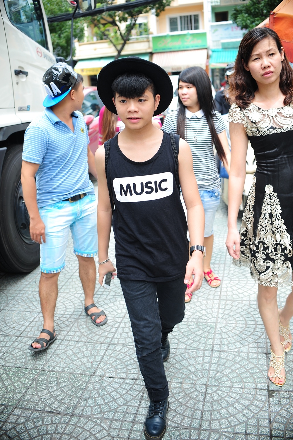 Quán quân của Giọng hát Việt nhí mùa 1 - Quang Anh - diện cả cây đen tới buổi ghi hình vòng đối đầu tại TP.HCM hôm 30/6.