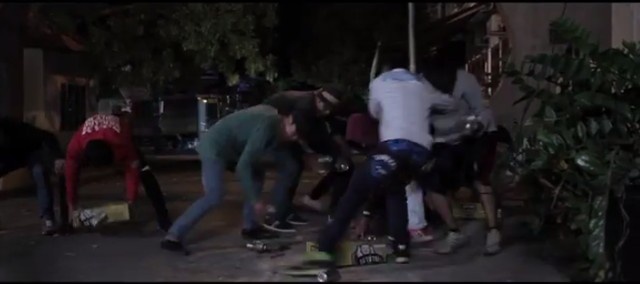 Clip quảng cáo có tựa đề “Hôi bia đại chiến”, là một thước phim ngắn hành động với sự tham gia của diễn viên Thái Hòa và Long Điền. Clip kéo dài gần 5 phút, trong đó diễn tả cảnh một anh tài xế chở bia Sư tử trắng, khi xe bị đổ, hàng trăm lon bia lăn ra đường, dòng người bên đường hỗn hào lao vào. Cảnh hỗn chiến, đánh nhau để giành giật bia diễn ra.