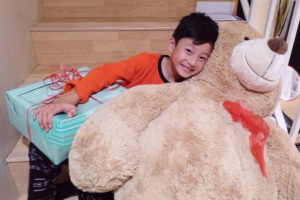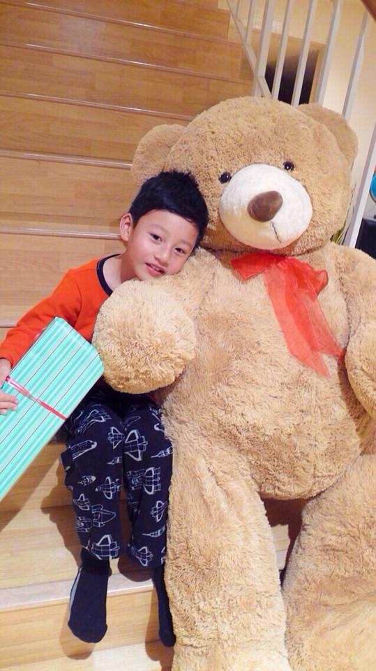 Vài phút trước, Quang Dũng chia sẻ trên trang cá nhân hình ảnh Bảo Nam bên một chú gấu bông to, thậm chí còn lớn hơn người cậu bé, kèm theo đó là một hộp quà khá lớn. Anh cho biết đây là hình "Bảo Nam nhận được quà của ba Dũng".