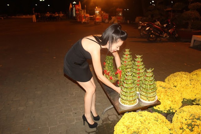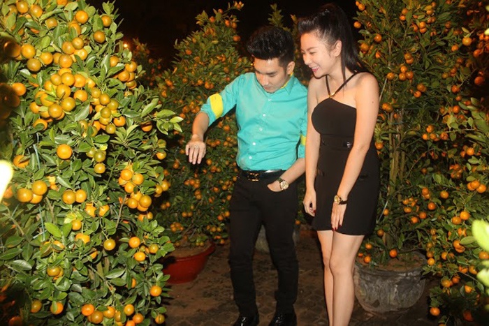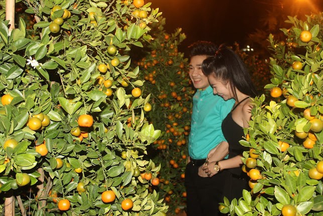 | Sau khi chọn hoa và cây mai, Quang Hà dẫn bạn gái qua khu vực trưng bày quất. Cặp đôi chọn được một cây sum suê trái. |