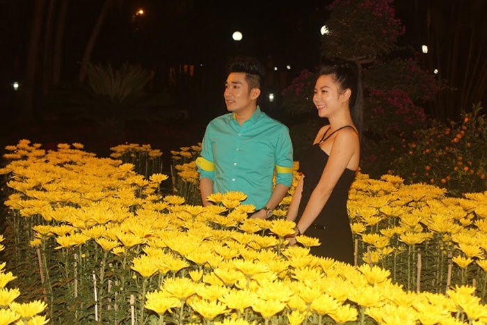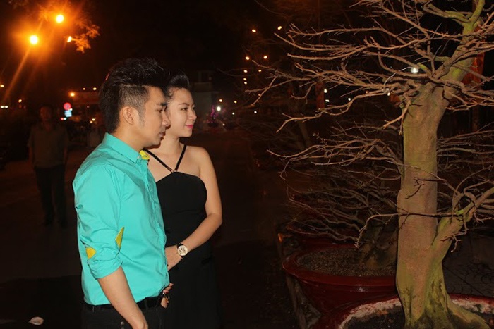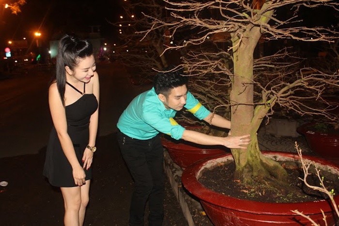 | Cặp đôi thích thú trước một cây mai lớn. Quang Hà cho biết những ngày này anh tranh thủ dành thời gian đưa bạn gái đi ngắm phố phường cũng như sắm sửa Tết cho gia đình hai bên bởi từ đêm Giao thừa anh bắt đầu lịch chạy show dày đặc. |