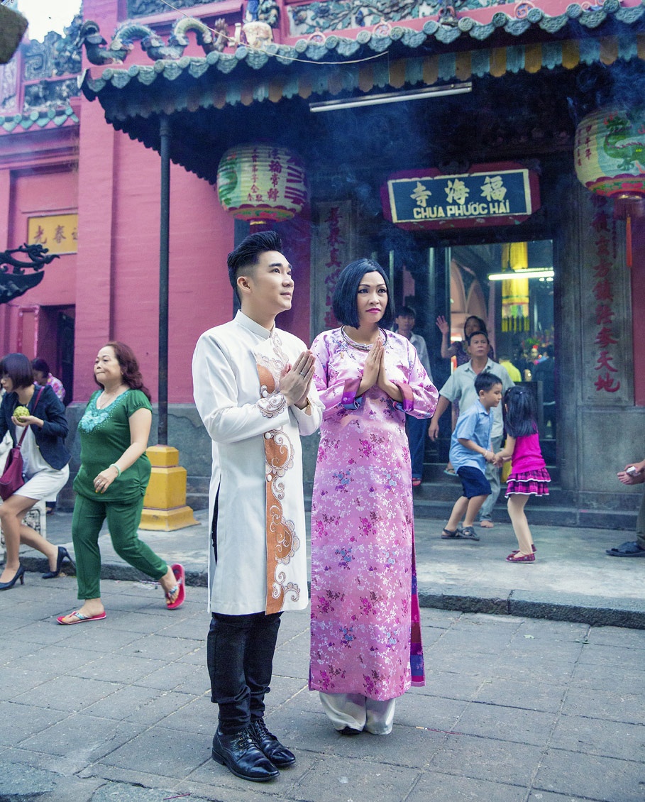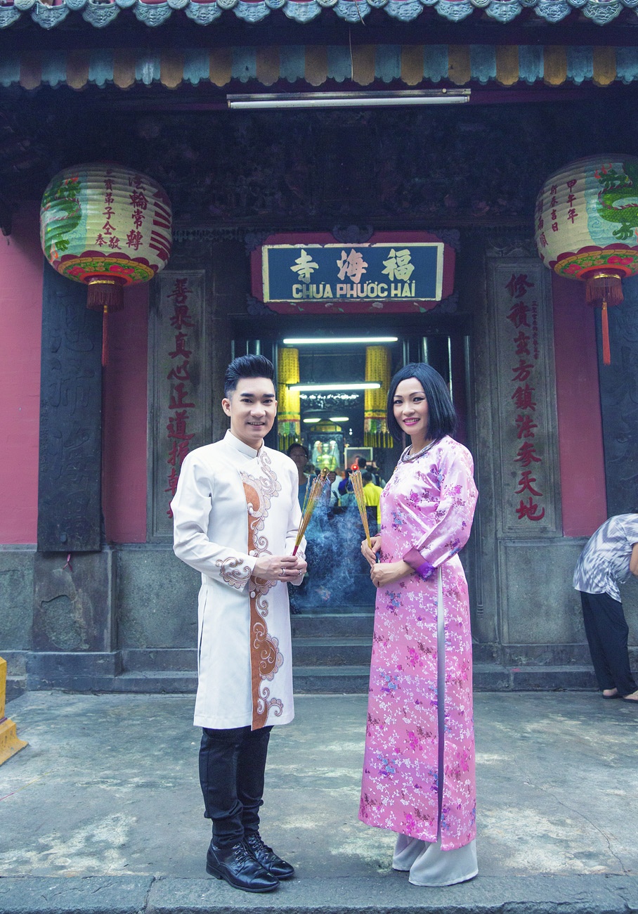 | Nhân dịp đầu năm mới, Phương Thanh và Quang Hà ăn mặc truyền thống lên chùa cầu nguyện cho mình và gia đình. |