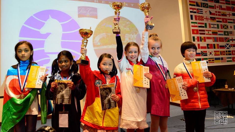 | Cầm Hiền (thứ 4 từ phải sang) với chức vô địch lứa tuổi U8 nữ tại giải trẻ thế giới vừa qua. Ảnh: Vietnamchess |