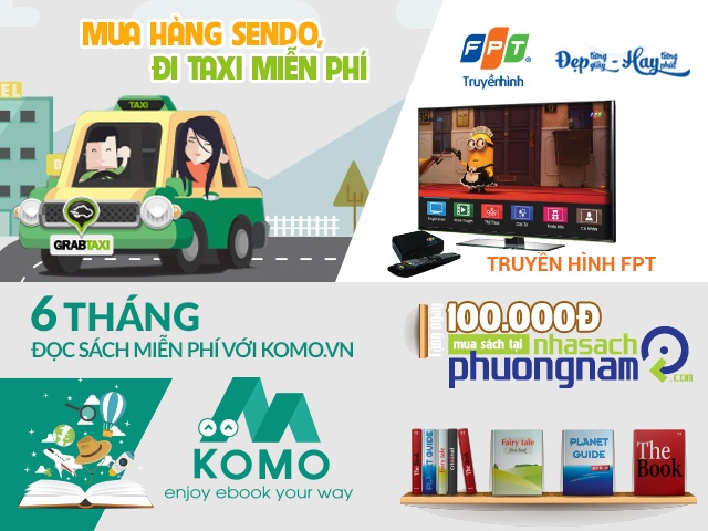 Nếu voucher mua sắm và cơ hội trúng vàng chưa đủ hấp dẫn bạn thì còn loạt quà tặng nữa mà Sendo dành cho các khách hàng trong dịp này, đó là tài khoản đọc sách online thỏa thích tại Komo.vn trong 6 tháng và voucher nhasachphuongnam.com trị giá 100.000 đồng. Gói truyền hình FPT trong 3 tháng tặng kèm HD Box với đủ cả các kênh K+ và phim Hàn Quốc cho các bạn. Cuối cùng là với mỗi đơn hàng thành công, bạn sẽ được một voucher đi GrabTaxi 90.000 đồng với 3 lượt sử dụng.