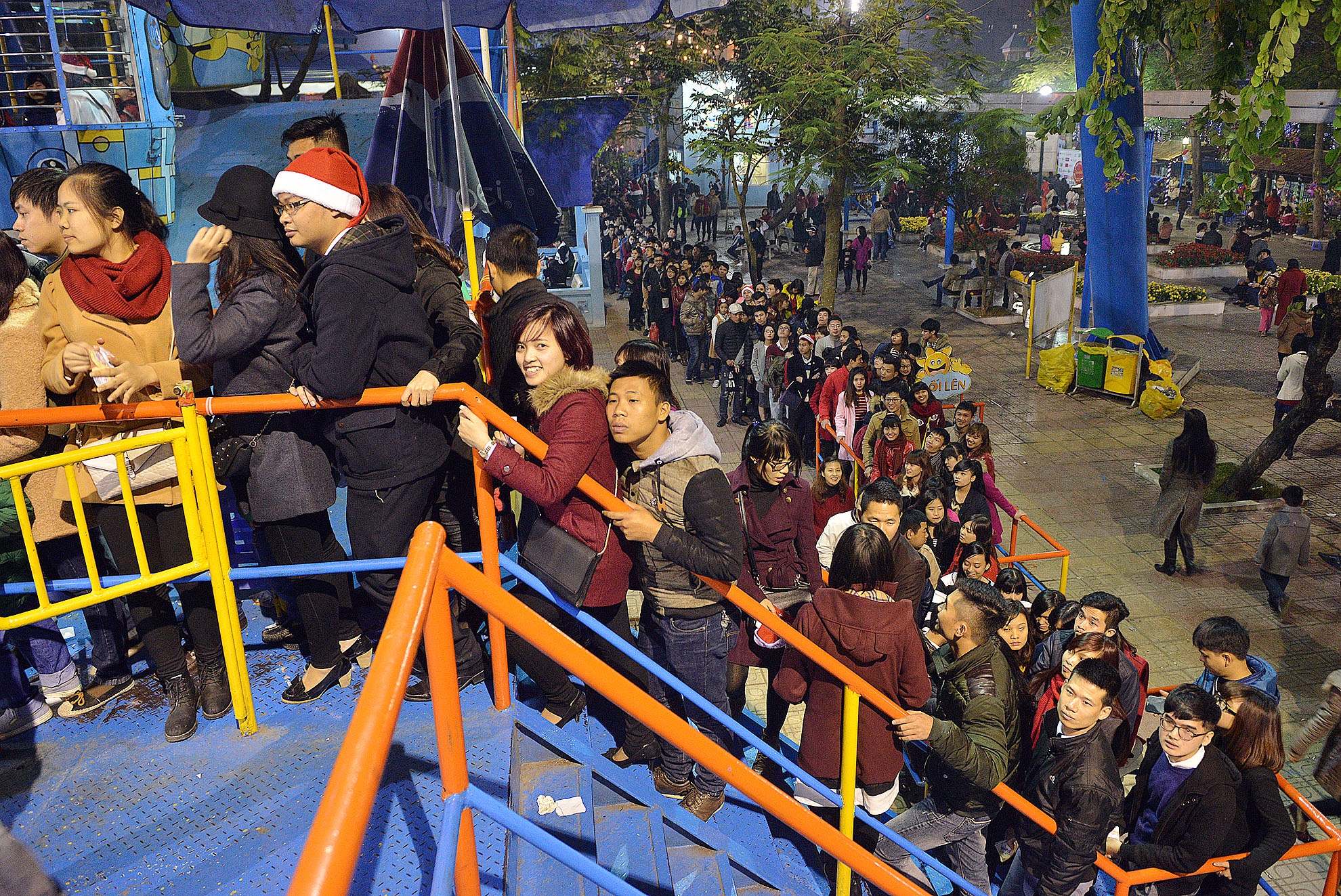 | Xếp hàng vào chơi trò chơi tại công viên nước hồ Tây. Ảnh: Lê Hiếu. |