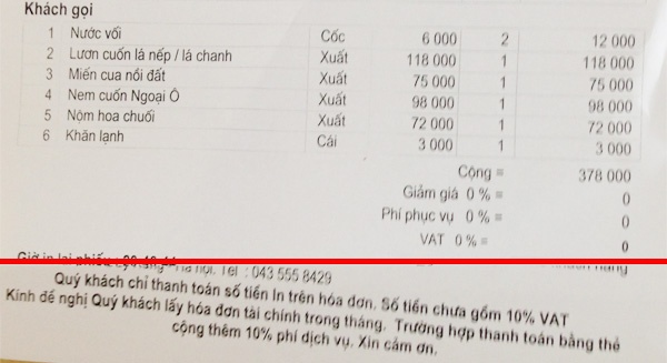 Không đồng ý, anh Đức vẫn một mực thanh toán hoá đơn bằng thẻ. Lúc này, cô nhân viên mới yêu cầu anh Đức đọc kỹ lại hóa đơn. Ngay góc dưới tờ giấy này ghi rõ: “Trường hợp thanh toán bằng thẻ cộng thêm 10% phí dịch vụ”.